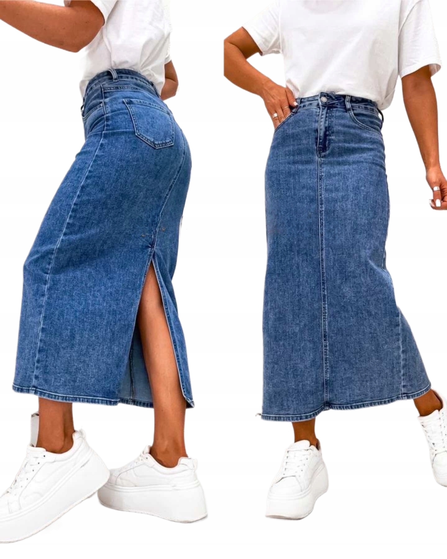 КЛАСИЧНА ДОВГА ДЖИНСОВА СПІДНИЦЯ-ОЛІВЕЦЬ МІДІ, КРИТА З ШЛІТОЮ S
