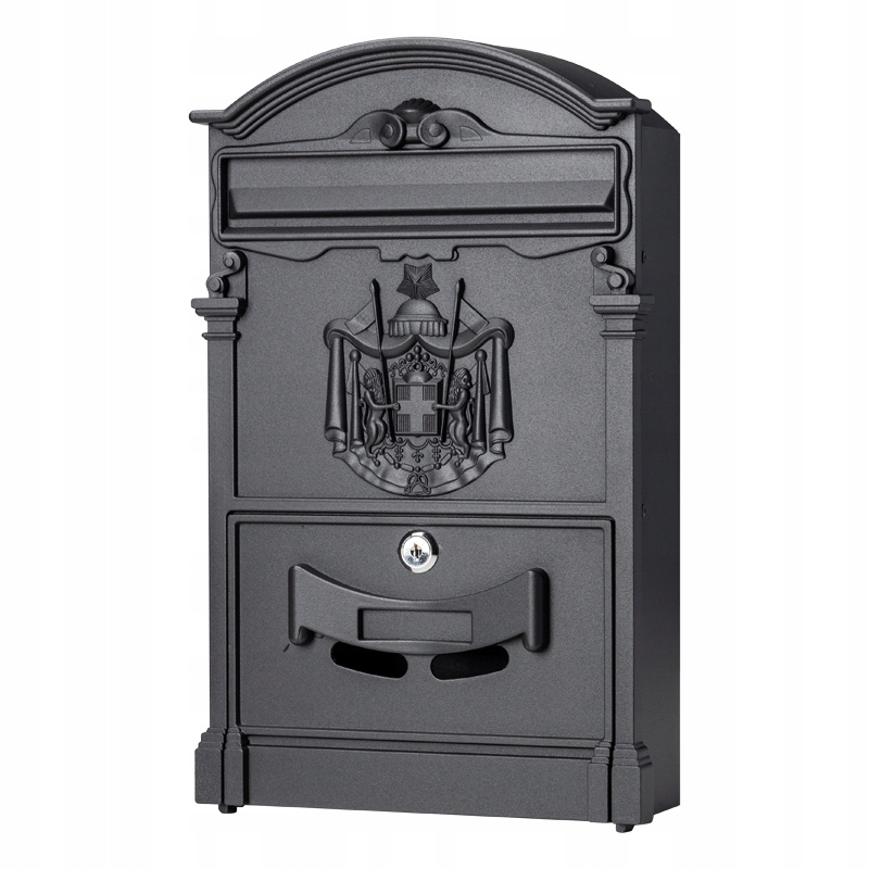 Почтовый ящик оснащен передней прорезью с крышкой, защищающей изделие от непогоды. условиях, а также запирающуюся входную дверь.
