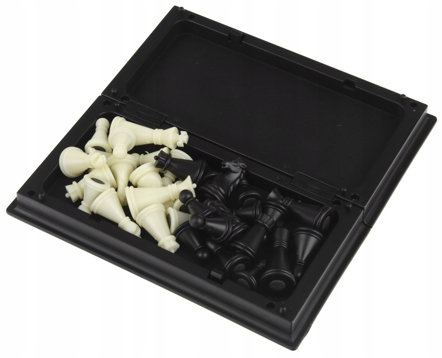 - 16 магнитных кремовых деталей. и 16 магнитных черных шахматных фигур.