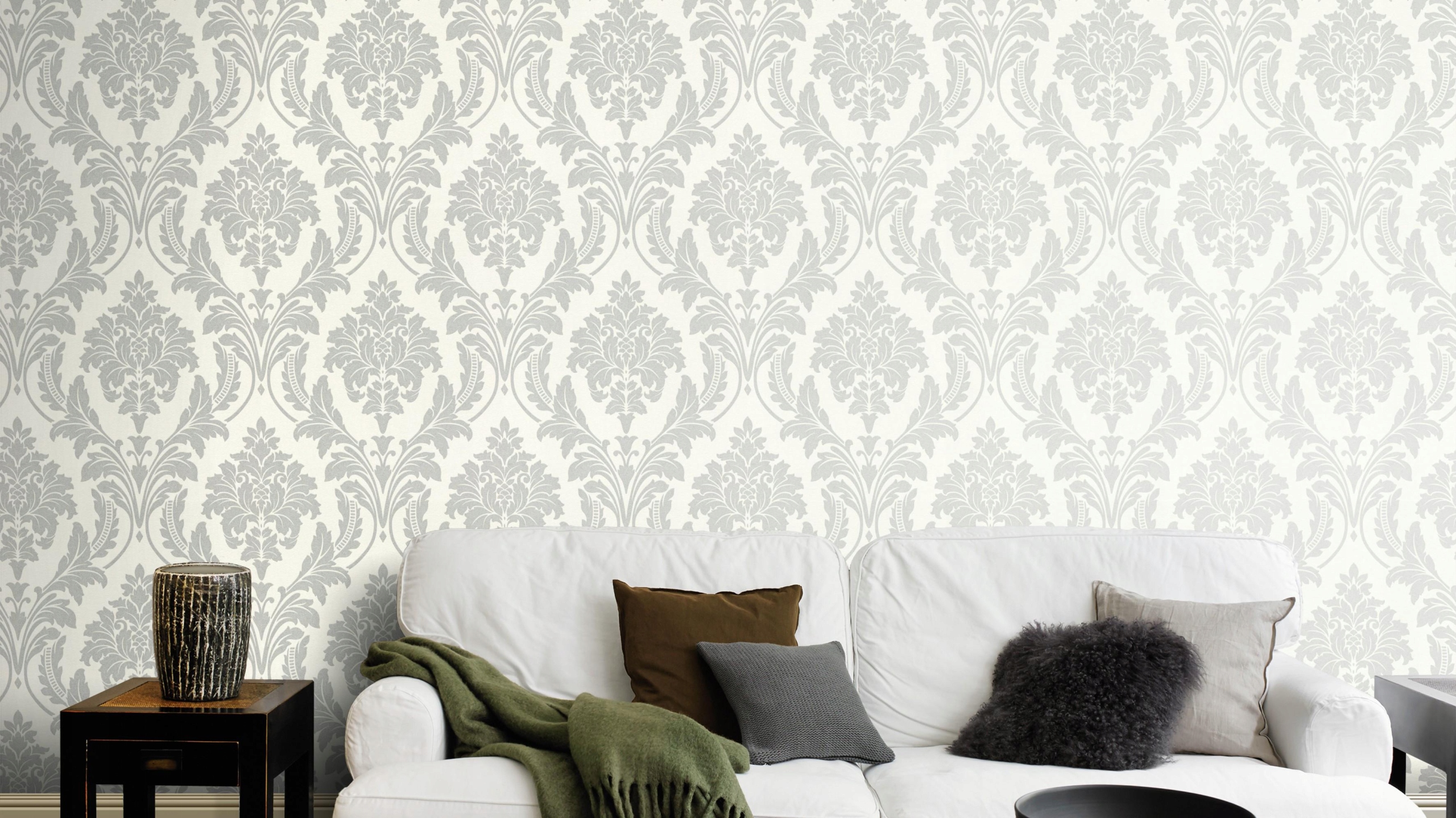 Теплый белый фон и серый слегка выпуклый узор. Все это делает обои прекрасным дополнением любого цвета.