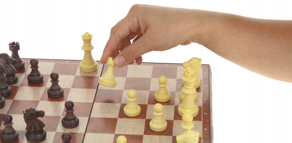 - 16 магнитных кремовых деталей и 16 магнитных коричневых фигур для игры в шахматы.
