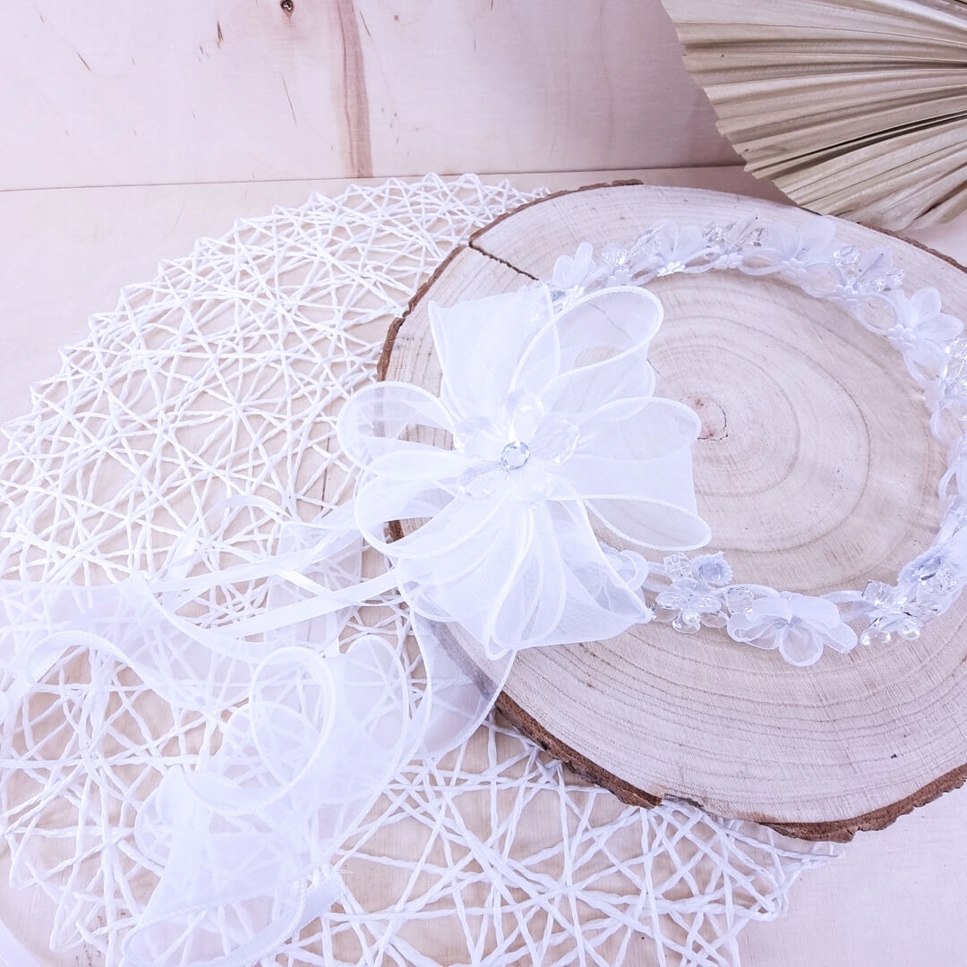 Элегантный венок для причастия девушки для празднования Таинства Первого Причастия, выполненный из белых и хрустальных элементов, полностью белый, изготовлен для девушки, которые хотят, чтобы в венок были вплетены натуральные веточки мерты. Ручной работы. Сочетание белых цветов из тюля и кристаллов создает элегантный классический эффект. В жизни ещё красивее. Классически оформленный, полный, отличного качества. Сзади венка бантик из тюля с завитками придает венку элегантность и утонченность. Все это выглядит красиво. Венок регулируется по окружности, можно уменьшить или увеличить его окружность под голову ребенка.