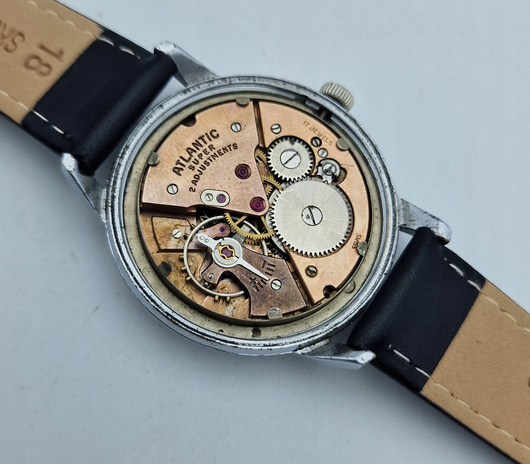 - Механизм наблюдения на 17 камнях, со швейцарской якорькой. Что касается механизма, подписи были нарушены: « атлантический супер, 2 корректировки, 17 драгоценности, швейцарский ». Механизм находится на хорошей и точной походке после обзора и технического обслуживания в The Watchmaker, в отличном состоянии.