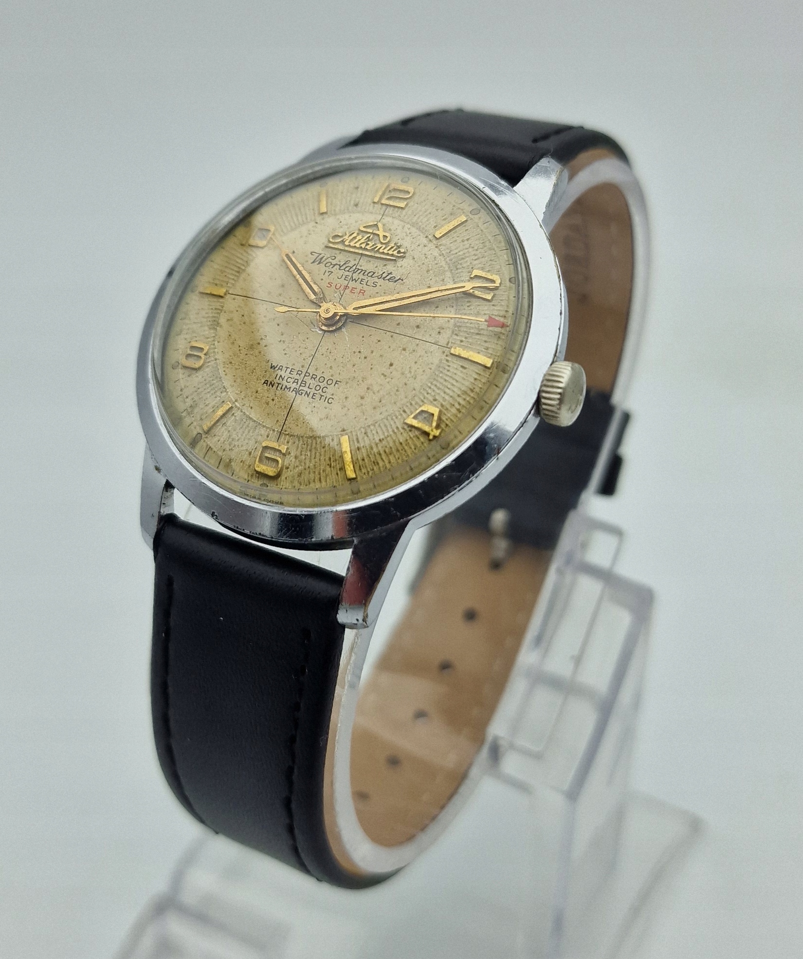 На этот раз я должен предложить вооруженные часы для ценителей и очарований. Это классическая модель Atlantic Worldmaster Super Watch 1950 -х годов, в хромированной конверте с incabloc и антимагнитным. Часы на хорошей прогулке. Почти в идеальном состоянии ...