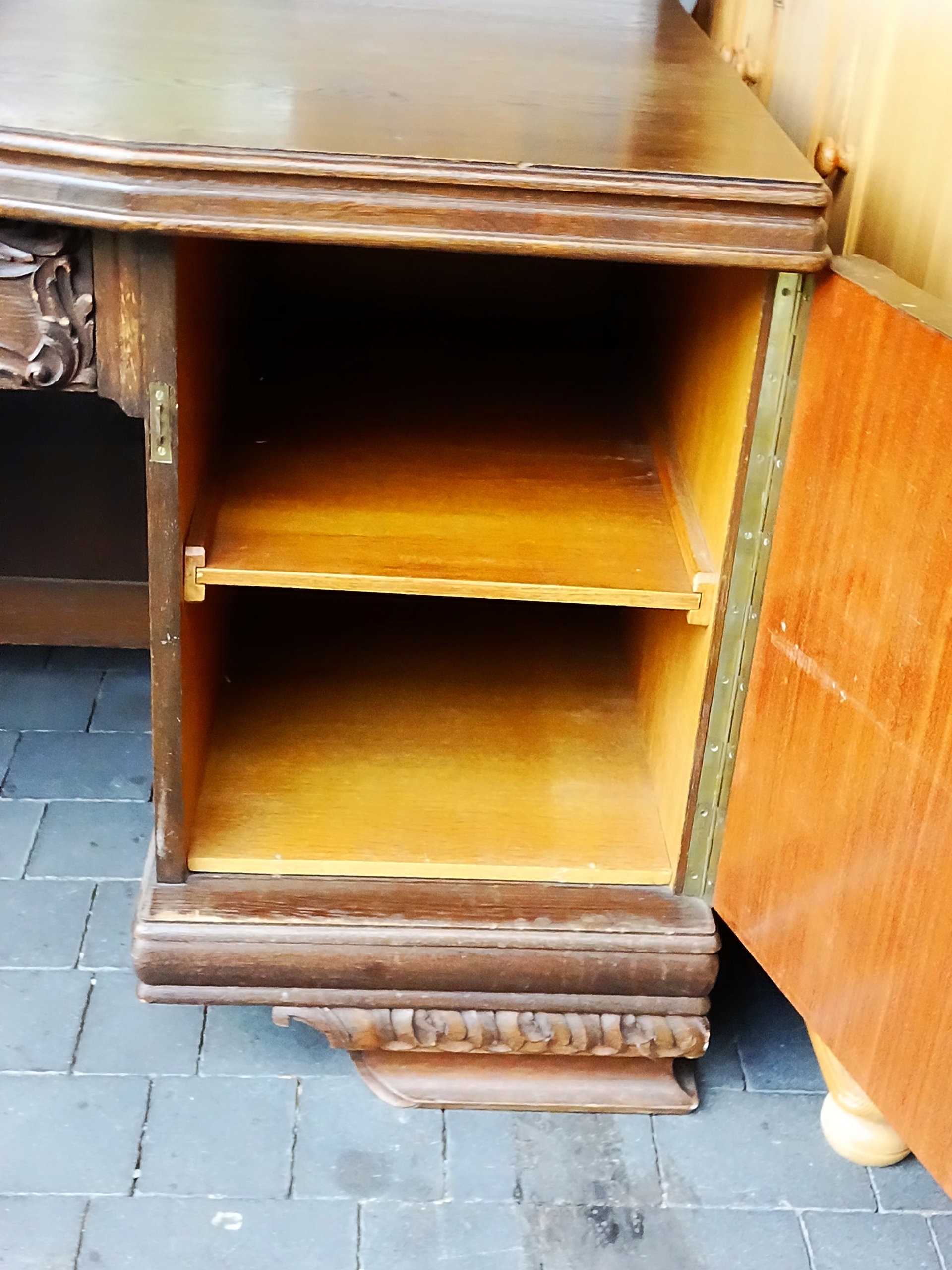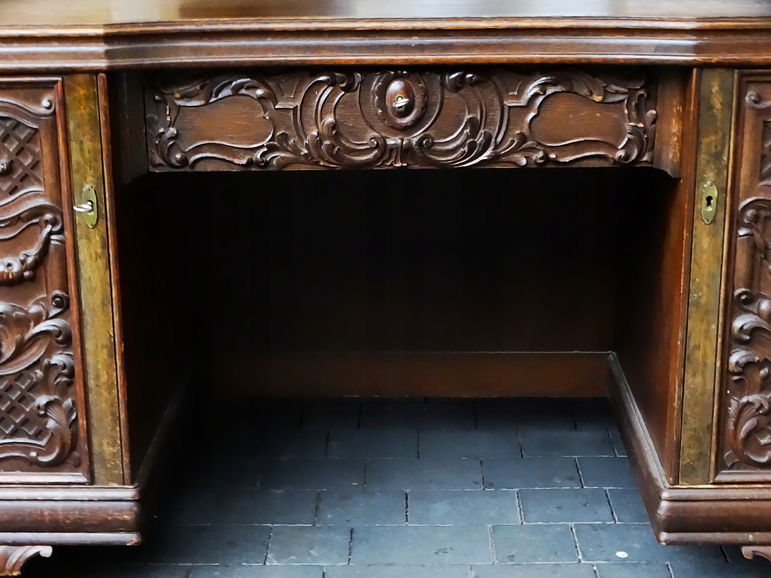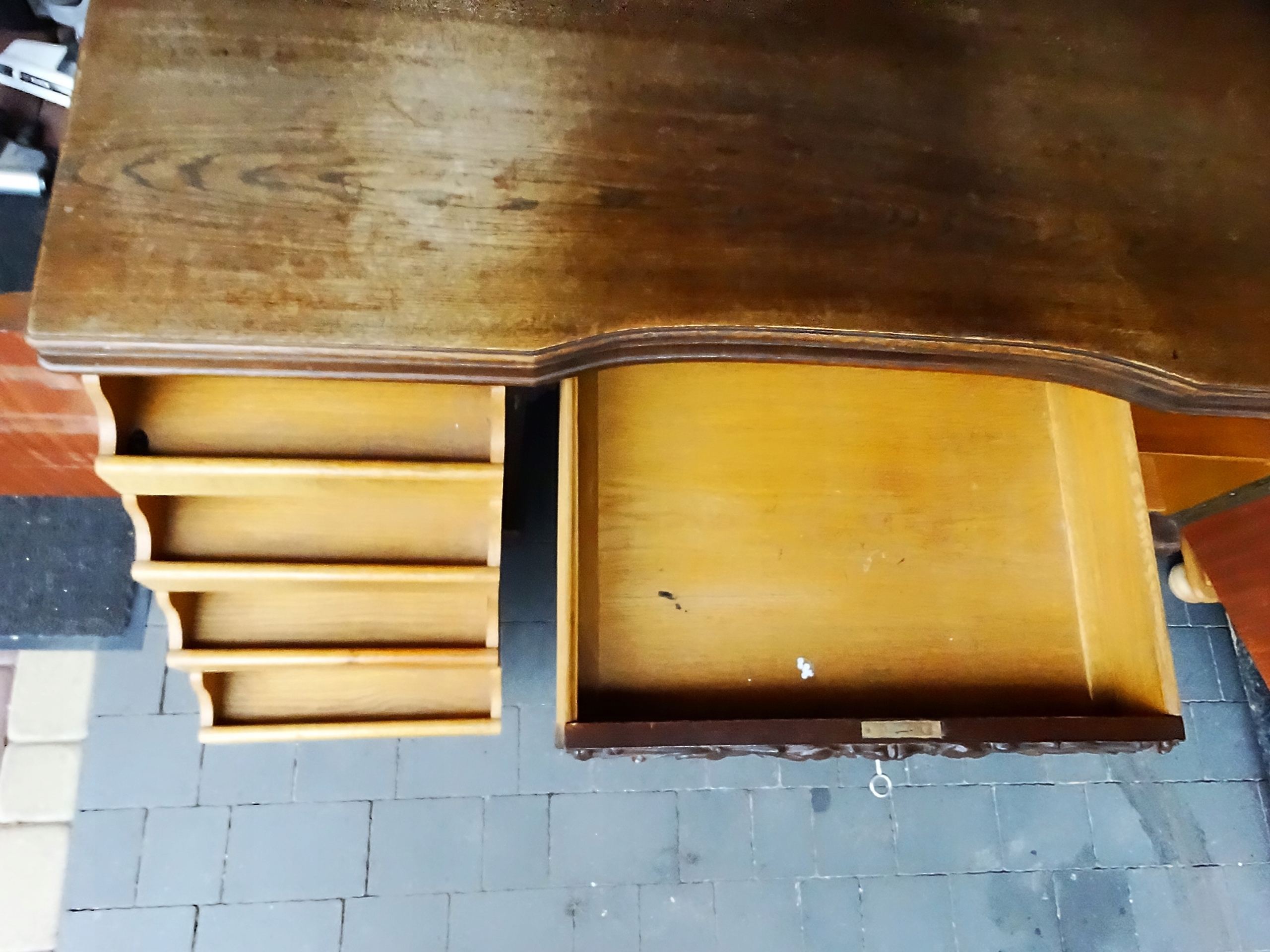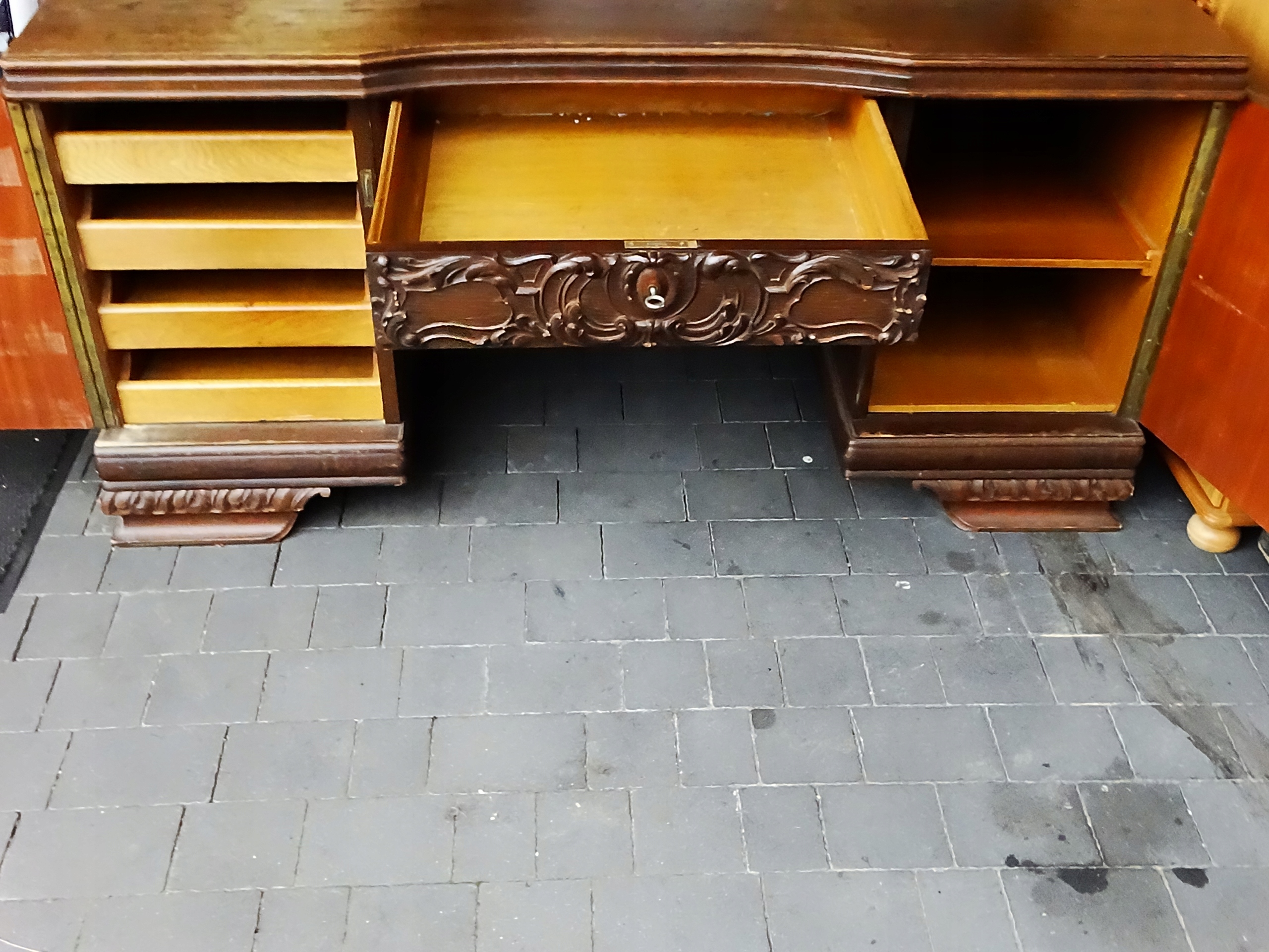 Стол б/у и находится в том состоянии, которое видно на фотографиях. Большой, прочный письменный стол с четырьмя ящиками слева, одним посередине и двумя полками справа. Приглашаю вас ознакомиться с ним и, конечно же, купить. Добро пожаловать.