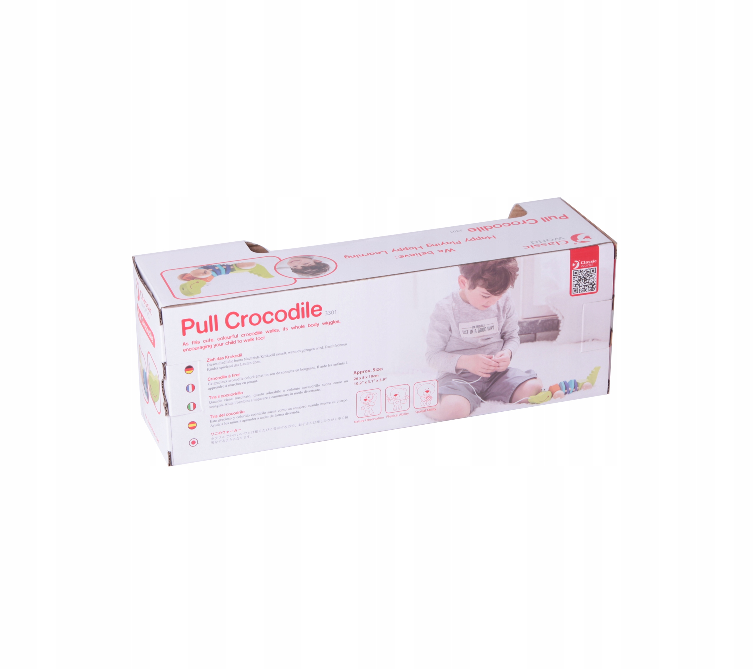 Посмотрите на этого крокодила! Очаровательное улыбающееся животное будет следовать за вашим ребенком, куда бы он ни пошел, все, что ему нужно сделать, это держи веревку. Крокодил Classic World – замечательная игрушка-качалка, которая при движении издает приятные звуки. Деревянная игрушка с колесиками и веревочкой побуждает ребенка практиковаться в ходьбе.