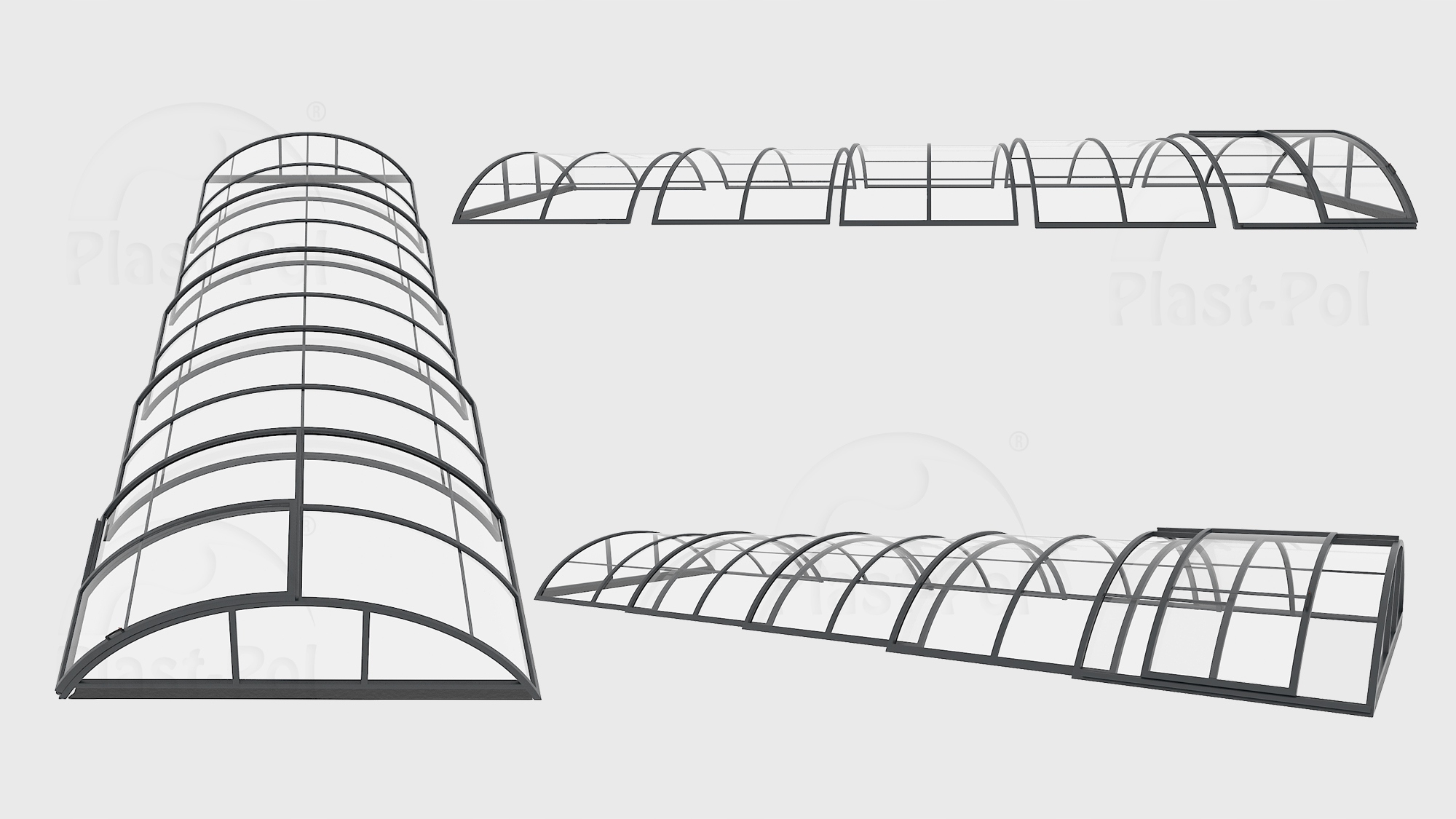 Рельсы изготовлены из алюминиевого сплава с отделкой из серебряного элокса. Направляющие оснащены защитой от порезов и противоскользящими решетками. Обтекаемые направляющие высотой 16 мм обеспечивают безопасное пользование зоной бассейна. В конструкции рельса предусмотрена система «WIND STOP», предотвращающая подъем модуля порывами ветра. Поручни выдвинуты за пределы крыши, что позволяет легко перемещать все модули за бассейном и наслаждаться солнцем во время купания в солнечные дни. Полная свобода гарантирована благодаря профессиональной ходовой системе с 4 колесами на каждый сегмент, каждое из которых оснащено двойным закрытым подшипником из нержавеющей стали.