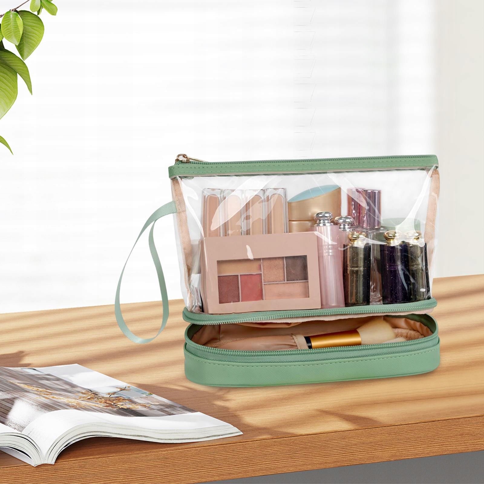 [Материал] Чистая косметическая сумка, созданная организатором из качества материала из ПВХ, который предлагает определенный уровень водостойкости, обеспечивая защиту и легкий доступ к косметике, если это необходимо