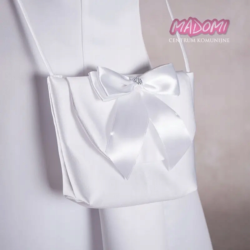 Сумочка для причастия из полуматового свадебного атласа. Внутри жесткое, поэтому сидит хорошо. Форма клатча с удлиненным низом. Спереди декорирован красивым бантиком с очаровательным блестящим кристаллом. Сумка застегивается на липучку.