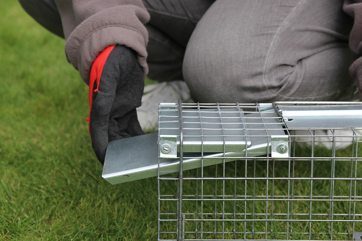 Вредитель, пытаясь снять приманку, активирует защелкивающийся механизм, закрывая ловушку.