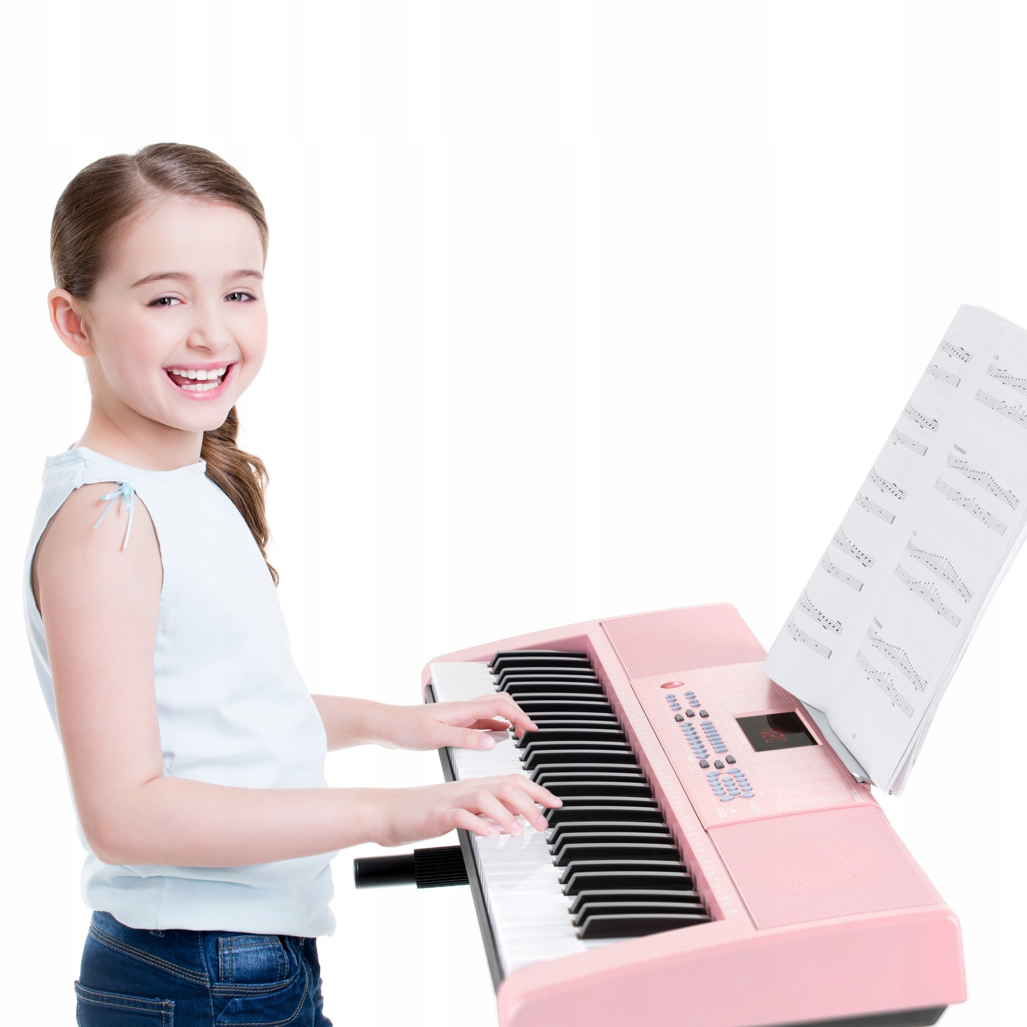 Клавиатуры для начинающих с 61 клавишей с подсветкой, 255 звуками, 255 ритмами и 50 демонстрационными песнями. Инструмент также может работать от аккумулятора. В комплект поставки входит блок питания, пюпитр и микрофон.