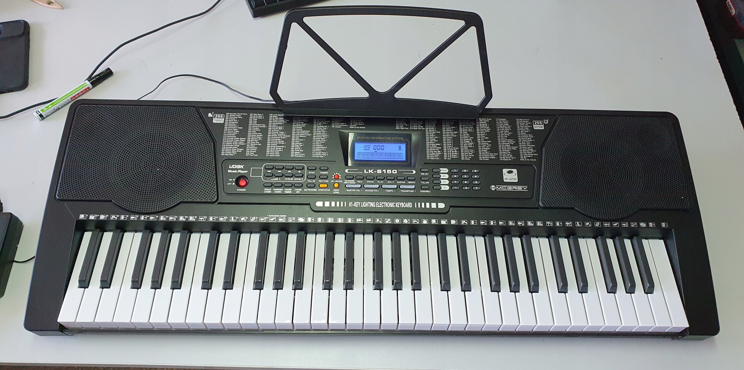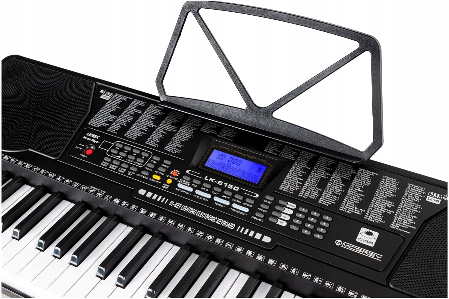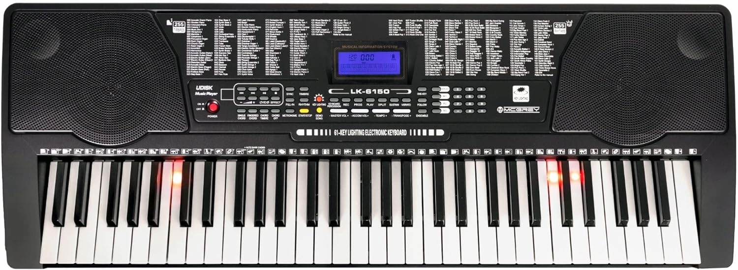 McGrey LK-6150 имеет длинный список функций. Помимо 61 клавиши с подсветкой, клавиатура имеет встроенный MP3-плеер, 3 различные функции обучения, вход для микрофона и 255 звуков и ритмов!