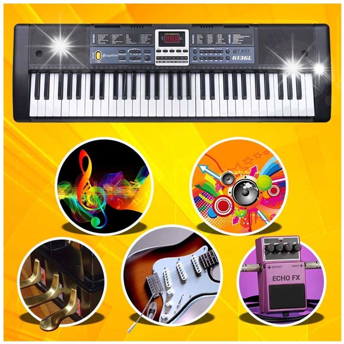 Клавиатура Suprimo 6136L — идеальный инструмент, чтобы научиться играть и получать удовольствие! Он имеет 61 клавишу. Богатый банк тонов, ритмических фонов и демонстрационных песен позволяет детям изучать звуки различных инструментов, ритмы и музыкальные стили со всего мира. Кроме того, после выбора звука барабана на клавиши назначаются различные ударные инструменты, что позволяет вам самостоятельно создавать и программировать ритм. Все это делает времяпровождение с Suprimo 6136L просто увлекательным!