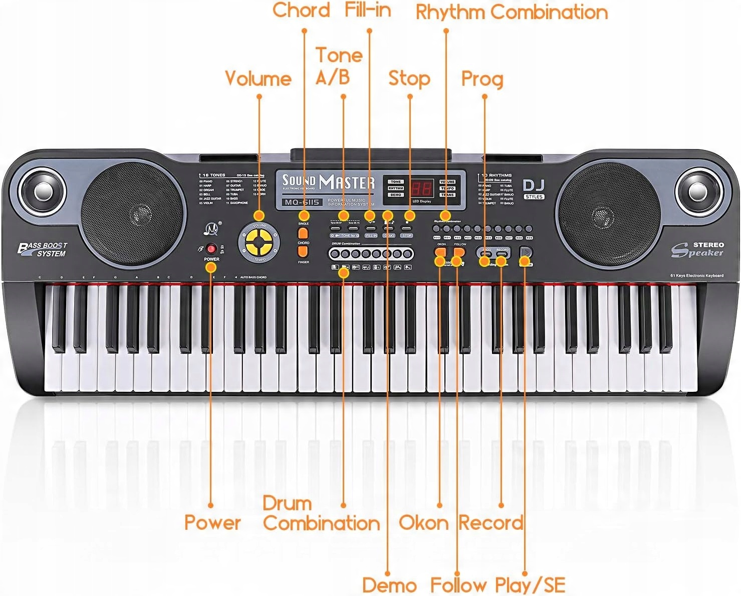 Электронная клавиатура с 16 звуками, 10 ритмами, 61, 6 демонстрационных песен и 8 барабанных звуков, программирование, запись и воспроизведение музыки. Благодаря микрофону, вы можете подключить наушники/микрофона, громко петь или тренировать себя