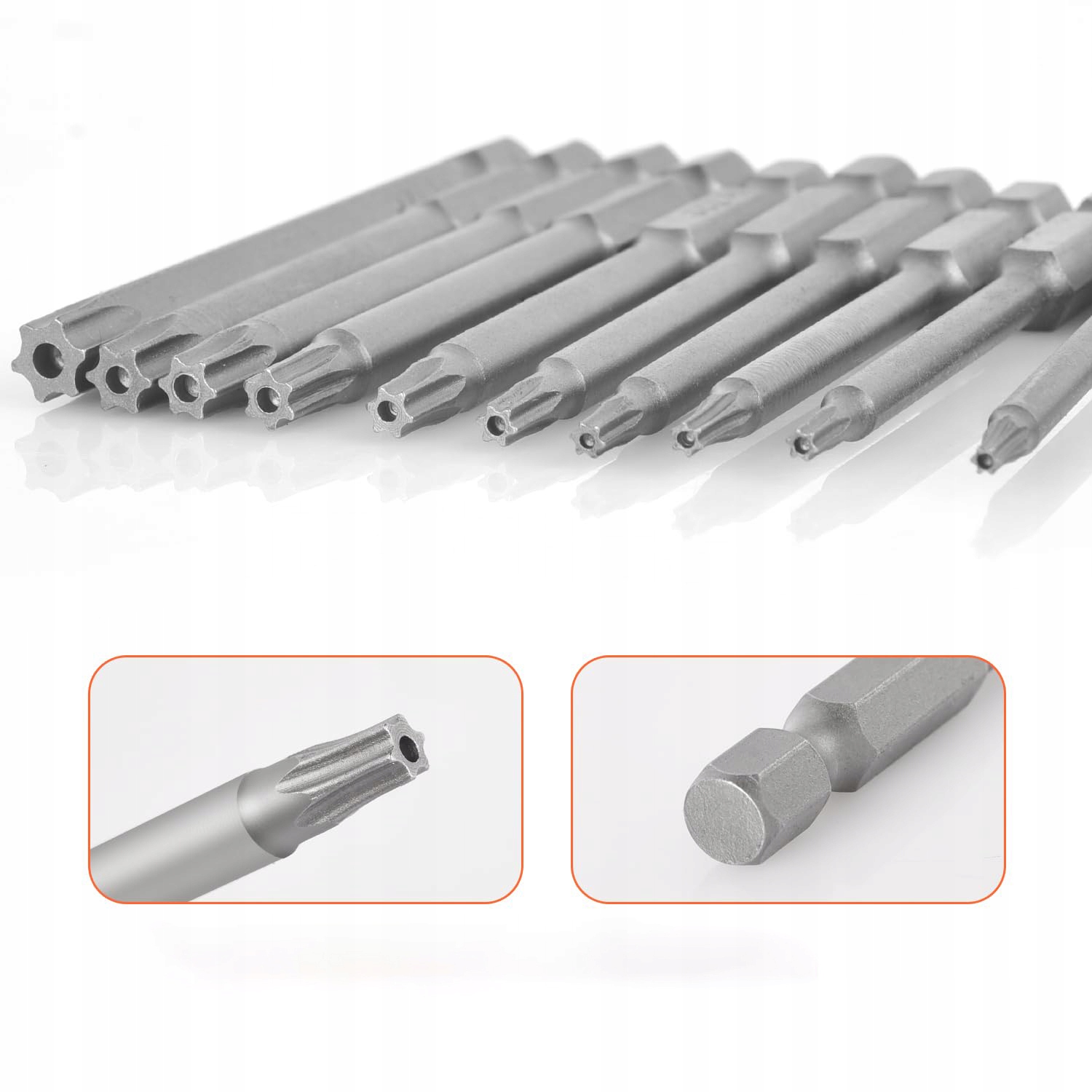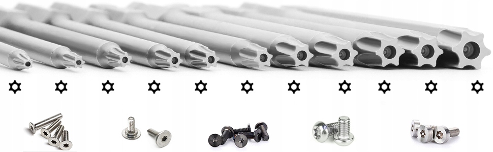 Комплект отвертки TORX: представляет собой 11 частей Torx битов длиной 100 мм; 11 размеров: T6, T7, T8, T9, T10, T15, T20, T25, T27, T30, T40; Изготовлен из стали S2, долговеченного, с внутренней пустой структурой, с магнитным шести -дюймовым шестигранником.