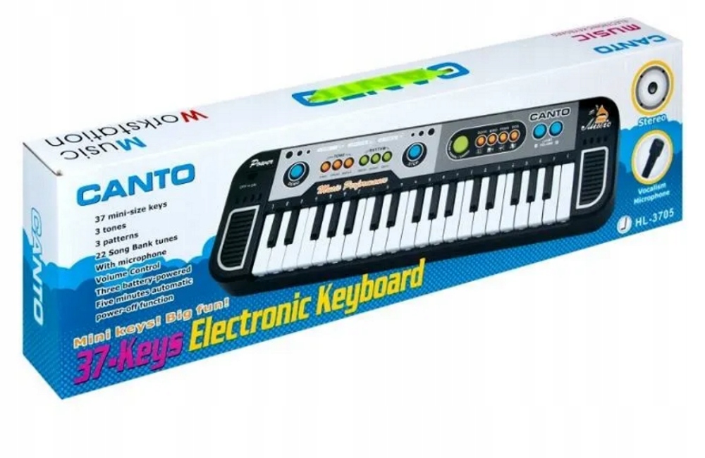 Клавиатура имеет 37 клавиш и множество кнопок с функциями, включая громкость управление, демо-мелодии, ритмы и звуки.