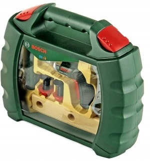 Чемодан для инструментов Bosch Ixolino создан широко известной и уважаемой компанией Klein. Сам чемодан зеленого цвета, имеет прозрачную переднюю панель, благодаря которой ребенок всегда может проверить его содержимое, не открывая чемодан, и две красные защелки, закрывающие чемодан. Внутри чемодана можно найти все, что нужно маленькому любителю DIY - отвертку, гаечный ключ, молоток, три больших черных шурупа, два гвоздя, две специальные планки с отверстиями для вкручивания шурупов, а главное - отвертку Bosch Ixolino, которая является точной имитацией своего настоящего аналога. Отвертка имеет два сменных винта, которые можно вращать влево или вправо, с высокой или медленной скоростью. Кроме того, эта игрушка оснащена звуковыми эффектами, которые делают игру с ней еще более похожей на настоящую поделку. Все элементы набора изготовлены из пластика и безопасны для детей.