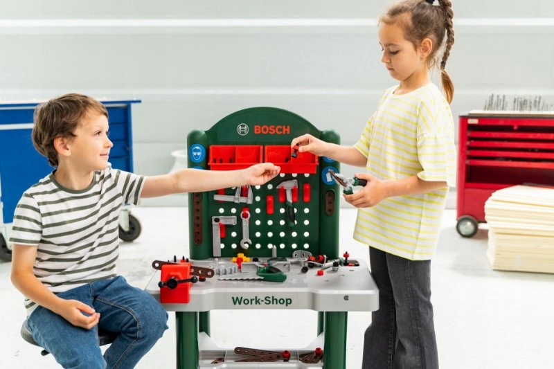 Полностью оборудованный детский верстак производится в Германии по лицензии Bosch. Столешница оснащена многочисленными обучающими функциями, тисками, практичными отделениями для хранения и 3 контейнерами для хранения. На задней стенке верстака своими руками и на полке под столешницей найдется место для качественных аксессуаров, некоторые из которых можно повесить на стену с помощью практичных крючков: плоская и крестовая отвертки, гаечный ключ, уровень, плоскогубцы и напильник. , молоток, пила, угольник и многое другое. Дети быстро и в игровой форме учатся пользоваться полосками, шурупами, гайками и винтовыми элементами разных размеров и форм.