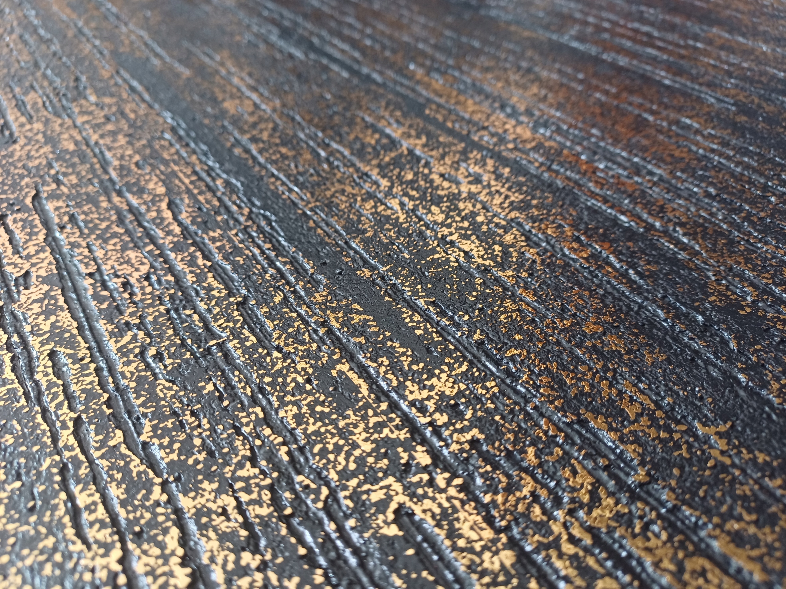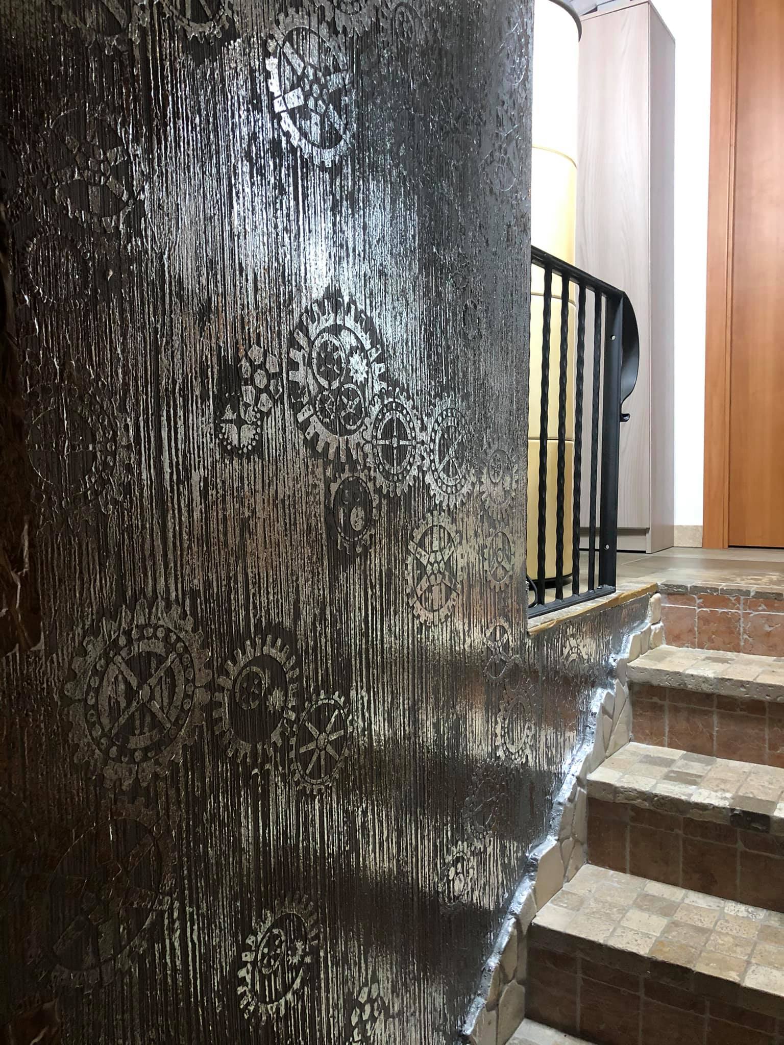 3 Этап Сразу после нанесения наносим начните формировать узор с помощью инструмента, например, венецианского шпателя, структурного валика или обычного малярного валика, гребенки, шпателя для травы. На фотографиях проекта, представленного на аукционе, кельмой для травы были получены параллельные структуры «царапин» на штукатурке. После создания конструкции дайте штукатурке немного подсохнуть примерно 20-25 минут (время зависит от температуры и влажности в помещении), а затем разгладьте ее венецианским шпателем. Сформированную таким образом штукатурку оставляют до полного высыхания примерно на 12 часов.
