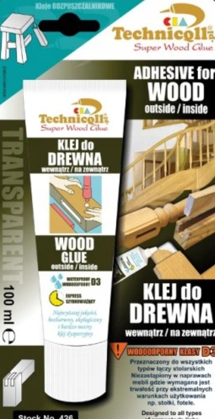 Новое поколение дисперсионного клея на водной основе. на виниловых смолах, применяется для склеивания древесины и всех древесных материалов, таких как фанера, ДСП, твердые и мягкие столярные плиты, ДСП. Он очень прочный и рекомендуется для столярных соединений. Широко применяется при монтажных и отделочных работах в быту и на производстве – внутри и снаружи помещений. Водонепроницаемый, с очень высоким классом D3.