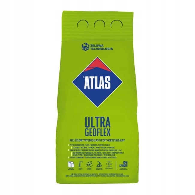 Клей для плитки Atlas Geoflex Ultra – продукт, позволяющий быстро и надежно монтировать все виды плитки, в том числе крупноформатную. Клей подходит для использования на самых сложных основаниях. Он очень пластичен и деформируется. Вы можете использовать его с полом с подогревом. Через три дня основа с клеем готова для пешеходного движения.