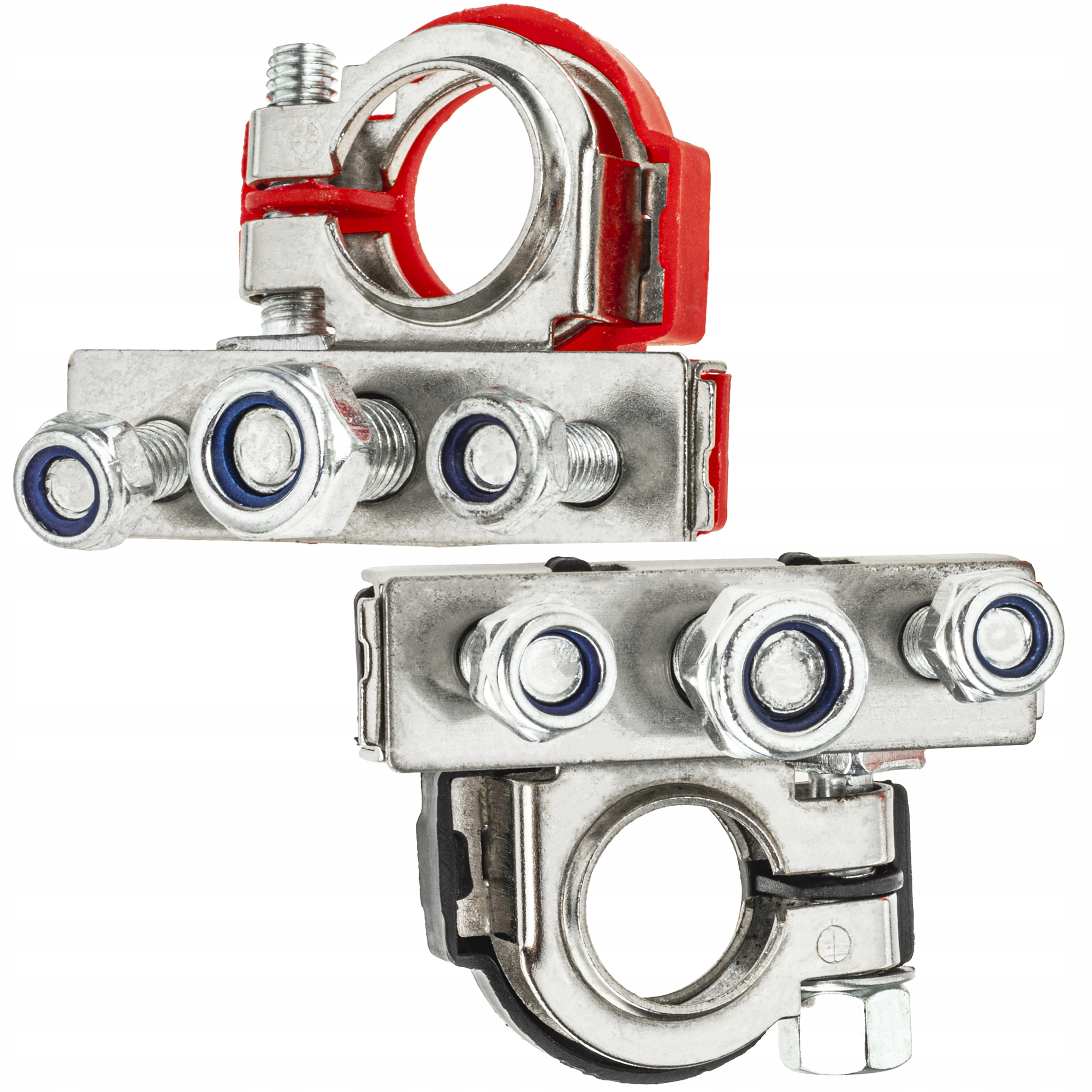 Хомуты универсальные с винтами М6 М8 М6, применяются в легковых автомобилях и грузовых фургонах. Универсальный элемент можно использовать во всех автомобилях. Клеммы имеют пластиковую крышку, дополнительно указывающую полярность, а в комплекте идут гайки. Крепление ключом на 10 и 13 мм.