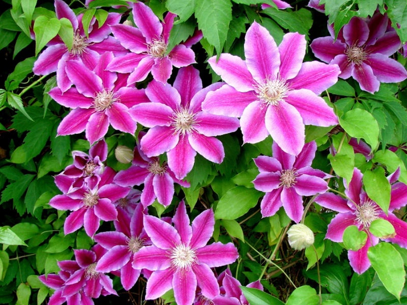 - Умеренно растущая лиана с красивыми двухцветными цветками, обвивающими опоры черешками листьев. Вырастает до высоты 2-3 м. Цветки крупные, до 18 см в диаметре, интенсивно-розовые, с пурпурной полоской в центре чашелистиков и светло-коричневыми тычинками. Цветет в мае на прошлогодних побегах. Цветение повторяется с июля по сентябрь, на побегах этого года. Лучше всего растет на плодородных, богатых гумусом, влажных, хорошо дренированных почвах с pH от нейтрального до слабокислого. Требует деликатной обрезки ранней весной, заключающейся в вырезании отмерших или поврежденных побегов.