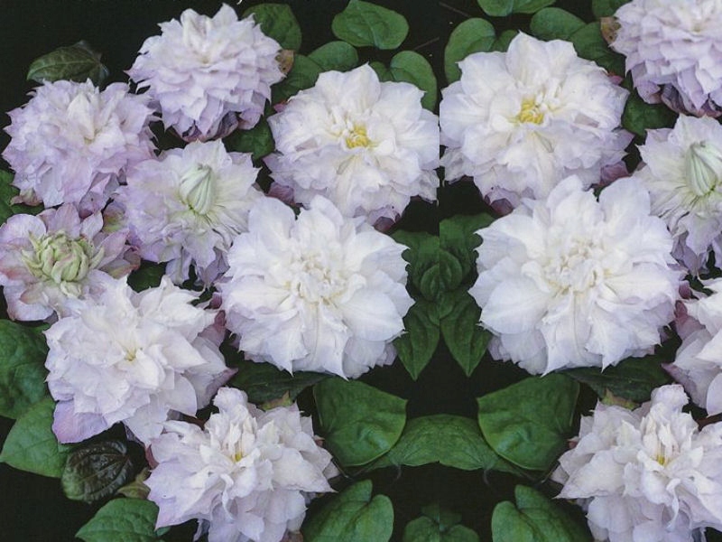 - Необычный сорт с махровыми, фиолетово-белыми, крупными цветками диаметром 16 см. Цветет с июня по июль на прошлогодних побегах. В августе повторяет цветение, осыпаясь одиночными цветками. У него красивые темно-зеленые блестящие листья. Достигает 2-3 м в высоту. Требует легкой обрезки (на высоте ок. 100-150 см над землей). Любит солнечные места. Может взбираться на естественные опоры, например, лиственные или хвойные кустарники и кустарники, не требующие сильной обрезки.