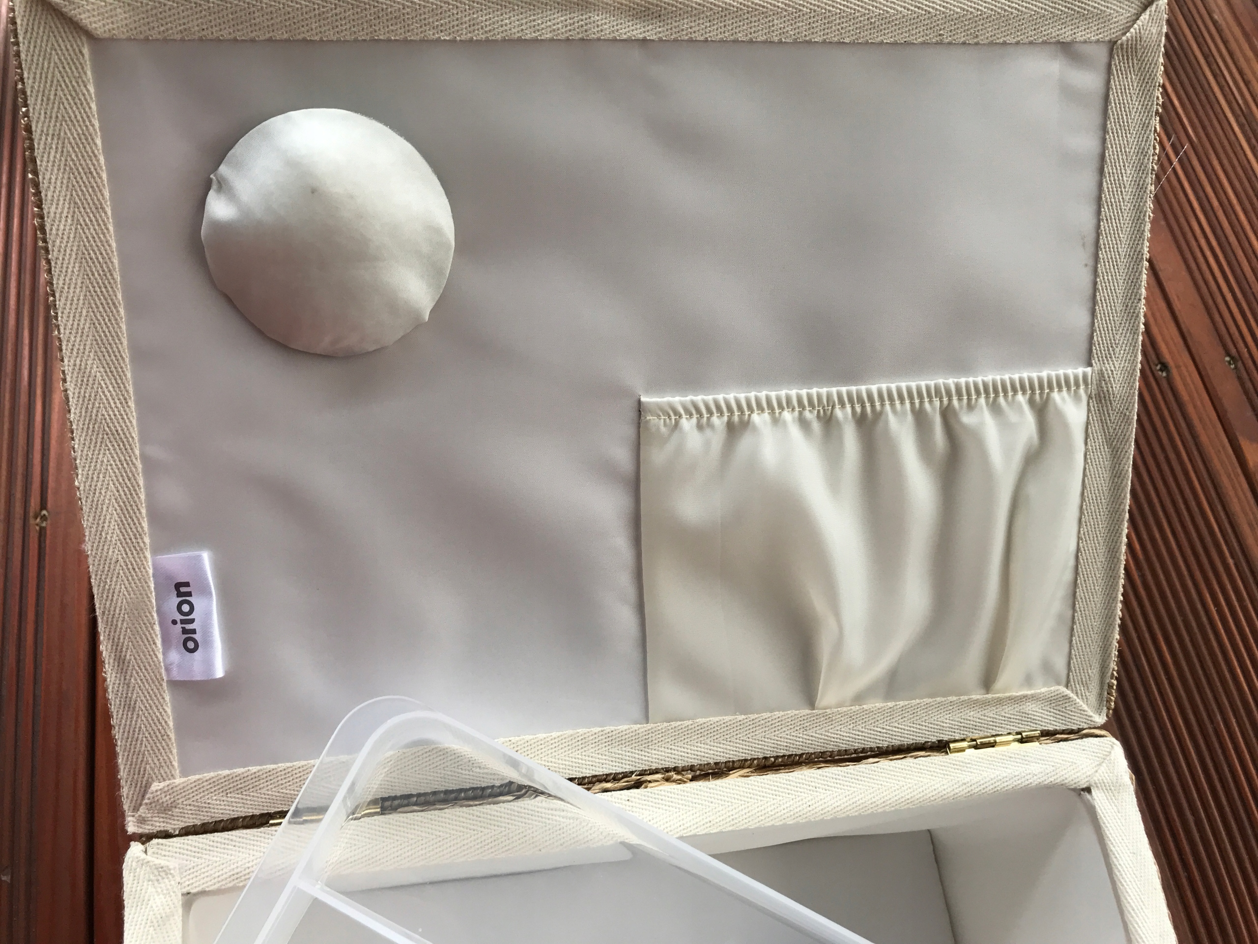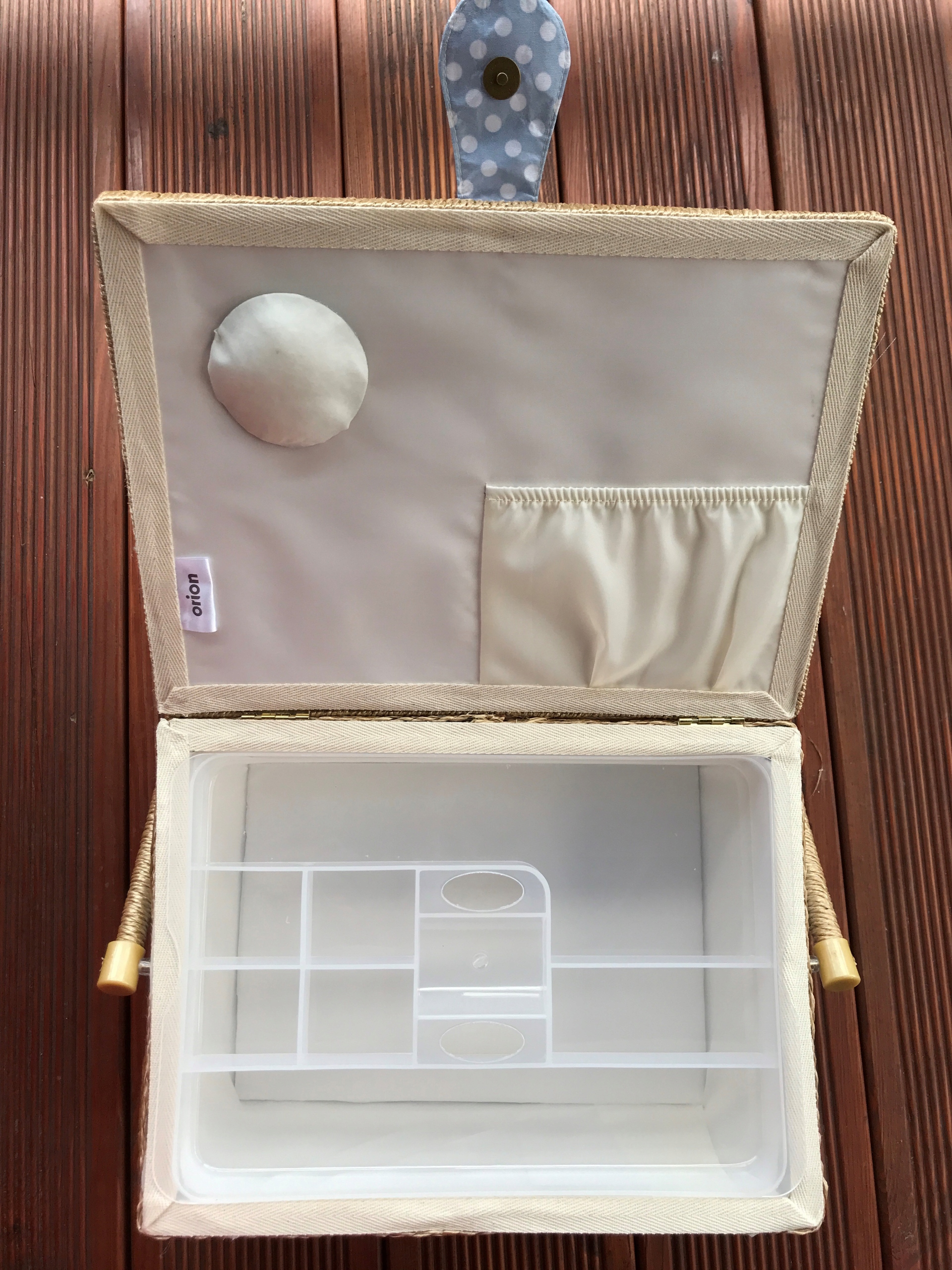 Внутренняя часть открывающегося клапана имеет подушечку для вставки иголок или булавок и практичный карман.