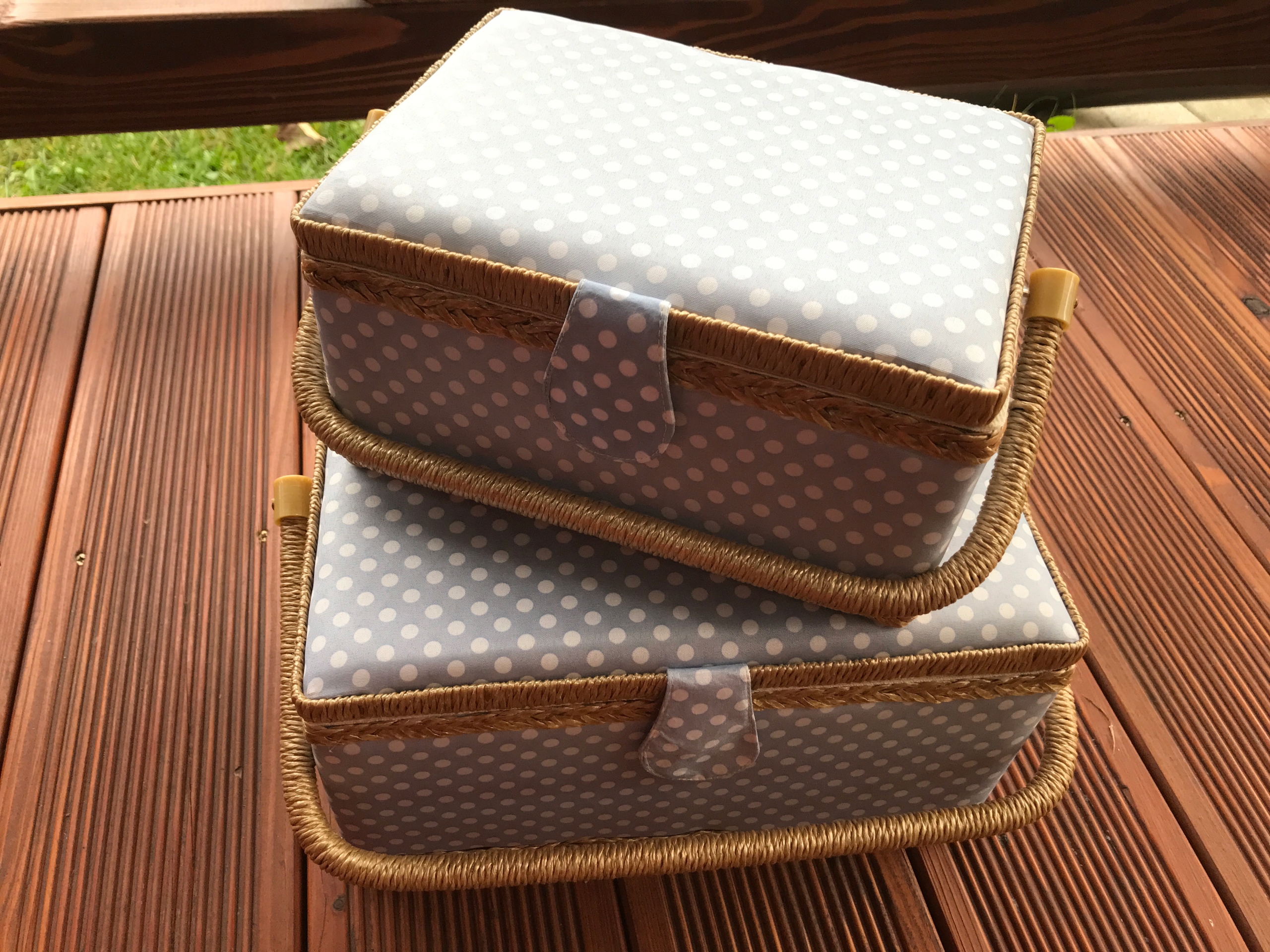 Из дерева с отделкой синей тканью в белый горошек.