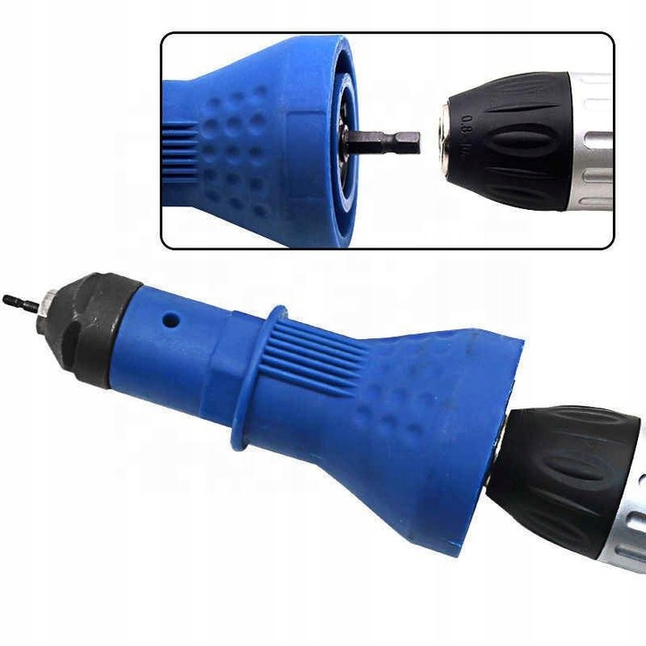 Заклепочник в виде адаптера для классической дрели/отвертки. Его основные преимущества – небольшой размер, быстрая установка и простота использования.
