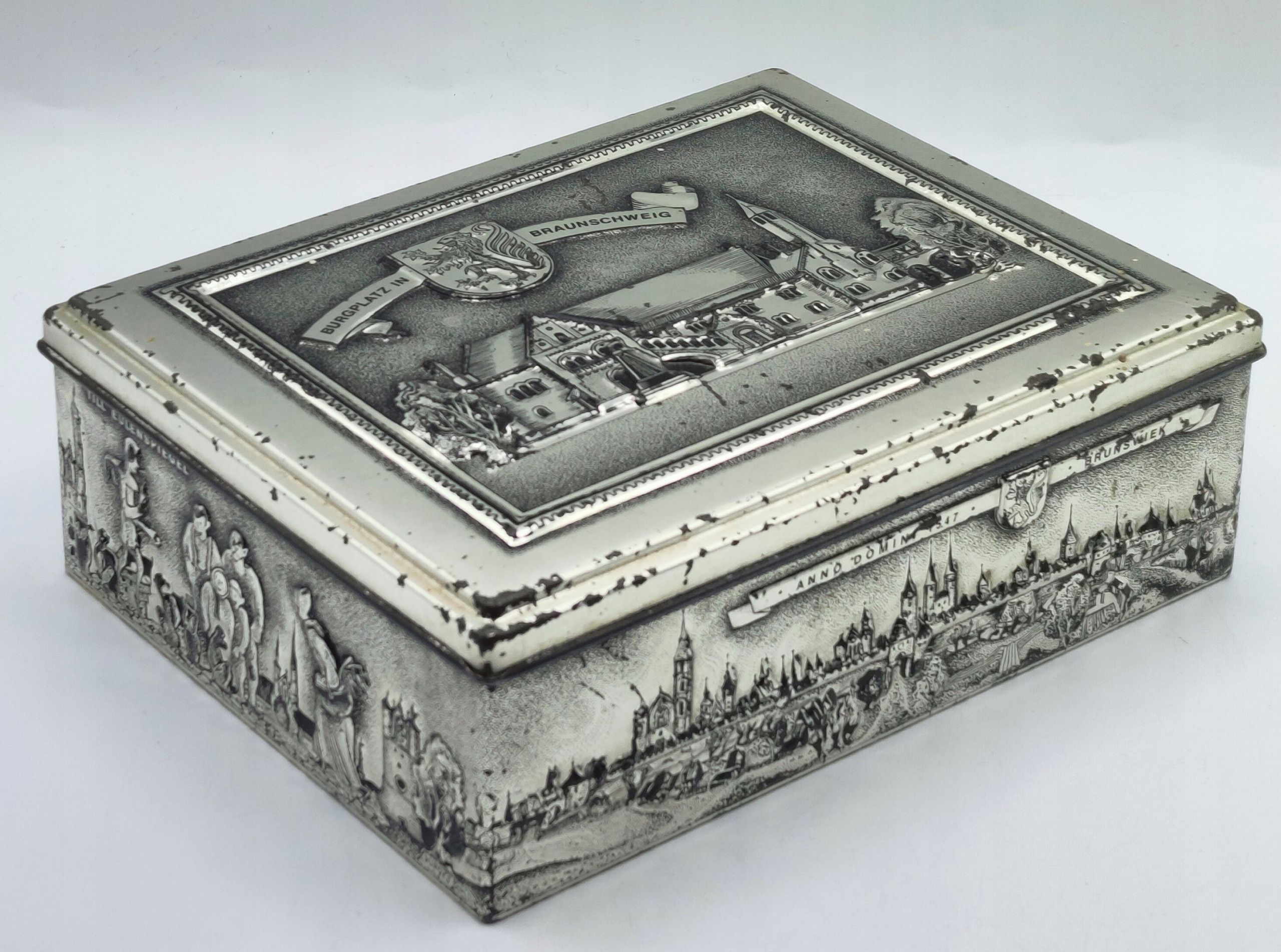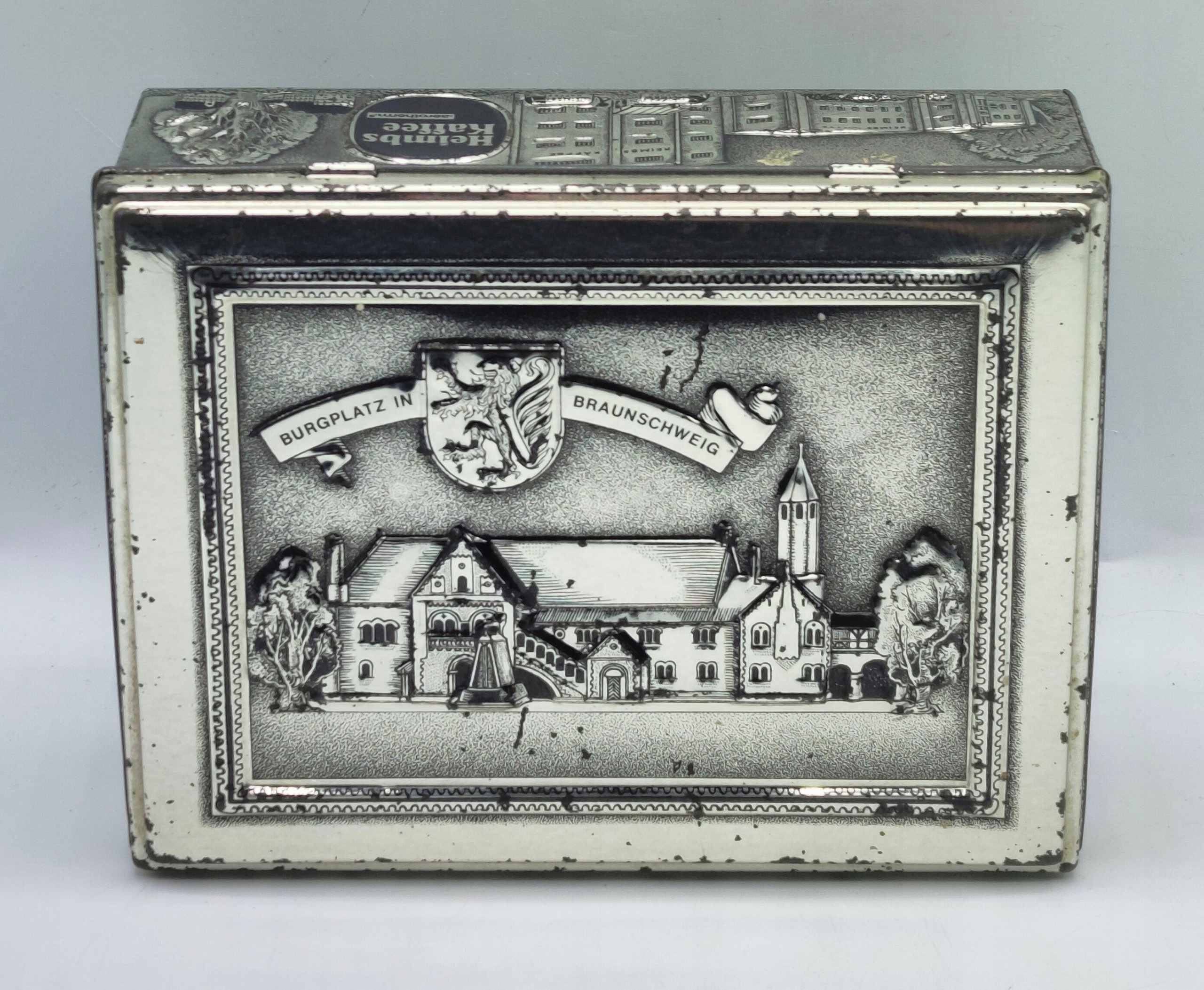 - это не магазинный товар, и это видно, это старая банка - коррозия, вмятины и царапины кое-где, но это только добавляет шарма жестяной банке, и все это дополняется красивые дворцовые мотивы,