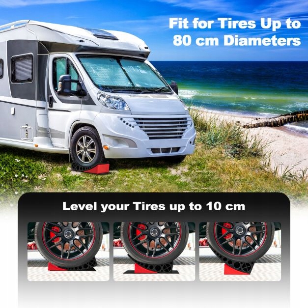 Этот комплект колодок подходит для автодомов с шинами диаметром до 32 дюймов (толщиной до 8 дюймов). Он эффективно выровняет шины высотой до 10 см и предотвратит занос автомобиля на мягких поверхностях. Благодаря этому вы сможете наслаждаться поездкой с высочайшим уровнем безопасности.