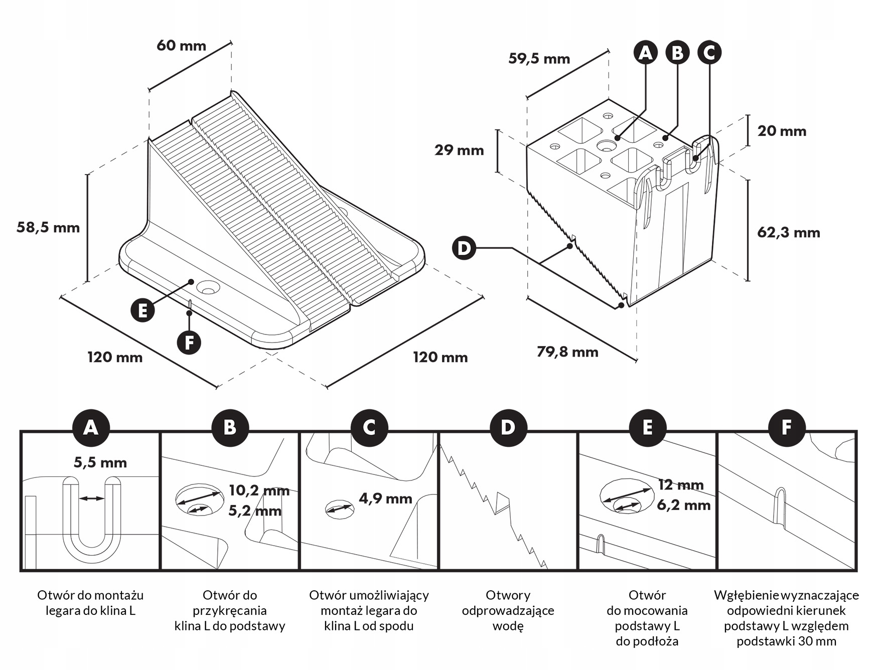 Клин L: Внешние размеры: Ширина: 59,5 мм, Длина: 79,8 мм, Высота: 62,3 мм. L-основание: Внешние размеры: Ширина: 120 мм, Длина: 120 мм, Высота: 58,5 мм