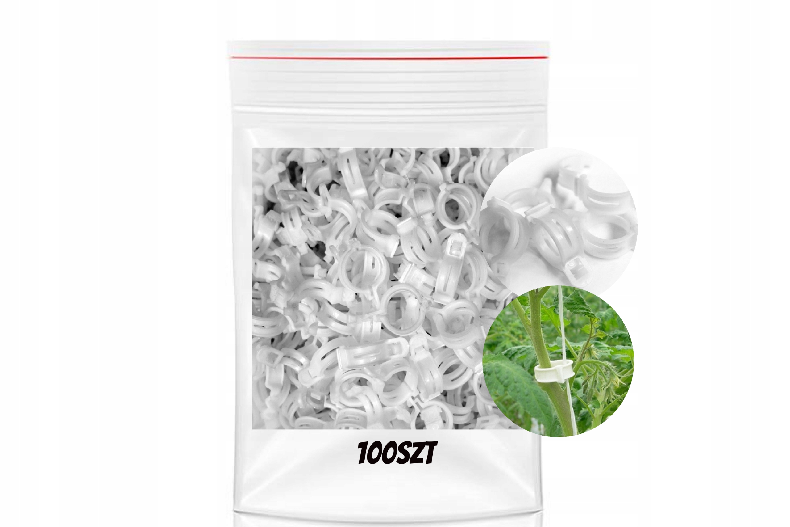 Благодаря прочному крючку и толстым стенкам, его часто используют на начальном этапе роста растений. Кроме того, застежка имеет одно вентиляционное отверстие. Данное изделие используется для крепления побегов, стеблей томатов, перца, огурцов, баклажанов, кабачков и фасоли, поддерживая таким образом растение и предохраняя его от поломки.