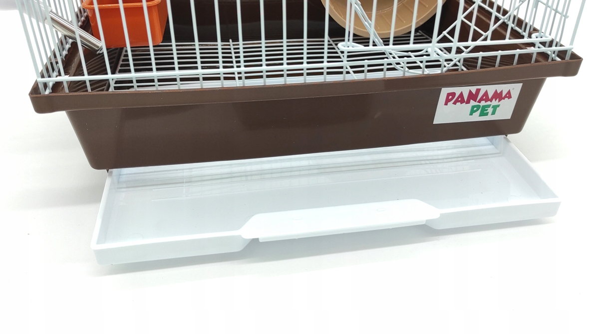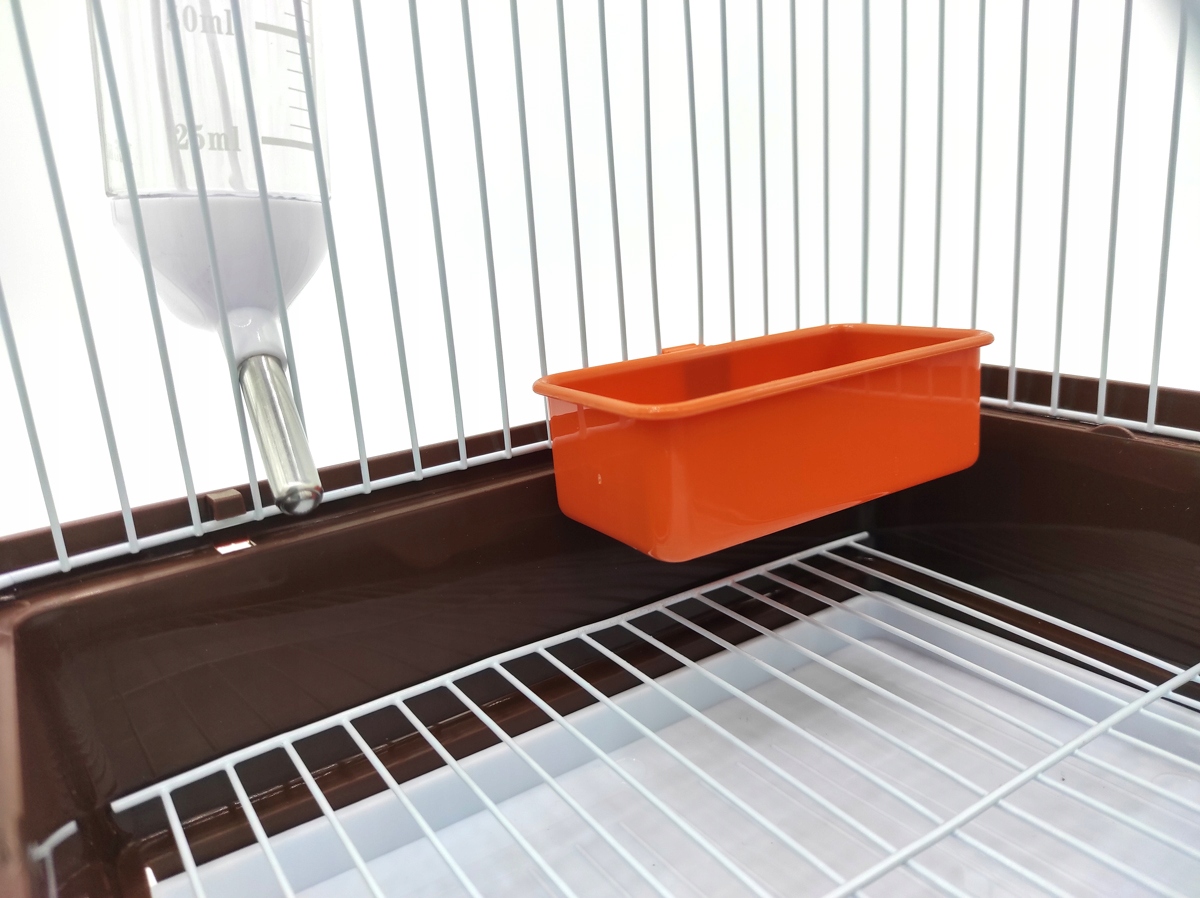 Клетка изготовлена из безопасных для животных материалов. Доступ внутрь клетки обеспечивается двумя дверцами, расположенными сверху и спереди клетки. Дно клетки цельное, пластиковое, верхняя часть из белой проволочной сетки.