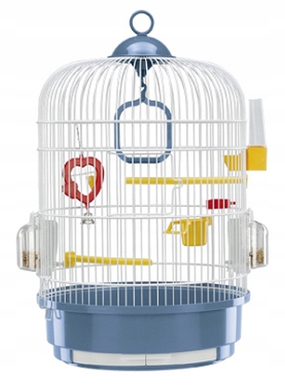 Удобная круглая клетка с оборудованием для канарейки, маленьких экзотических птиц и попугаев. С подвесной ручкой. Легко поддерживать чистоту. Размеры: 49 х 32,5 см.