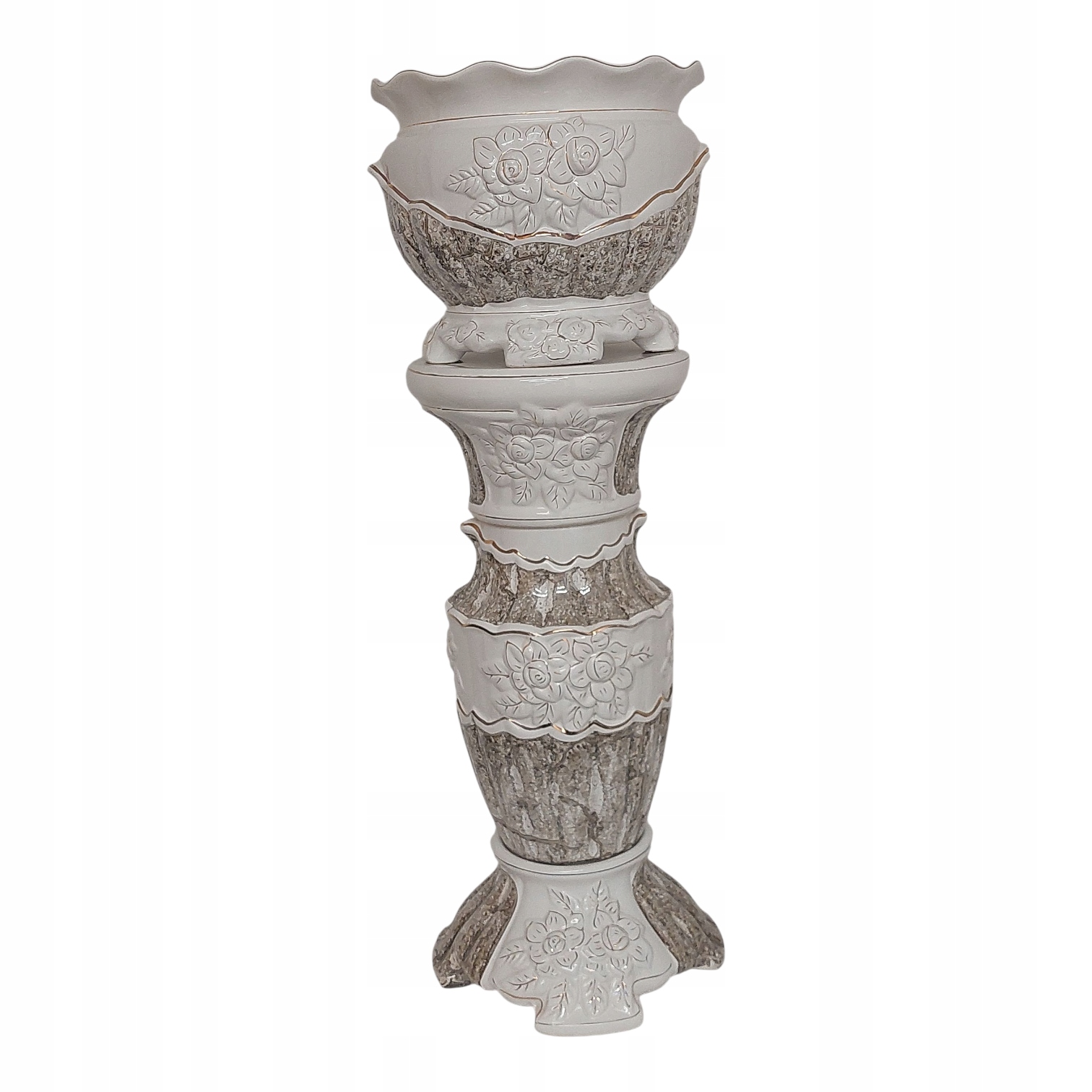 Подставка для цветов с горшком, размеры: общая высота 90 см, высота подставки для цветов 64 см, высота горшка 26 см, ширина горшка 30 см. На фото видны минимальные царапины. На кастрюле имеются трещины на эмали. На последней фотографии на подставке для цветов видна трещина.