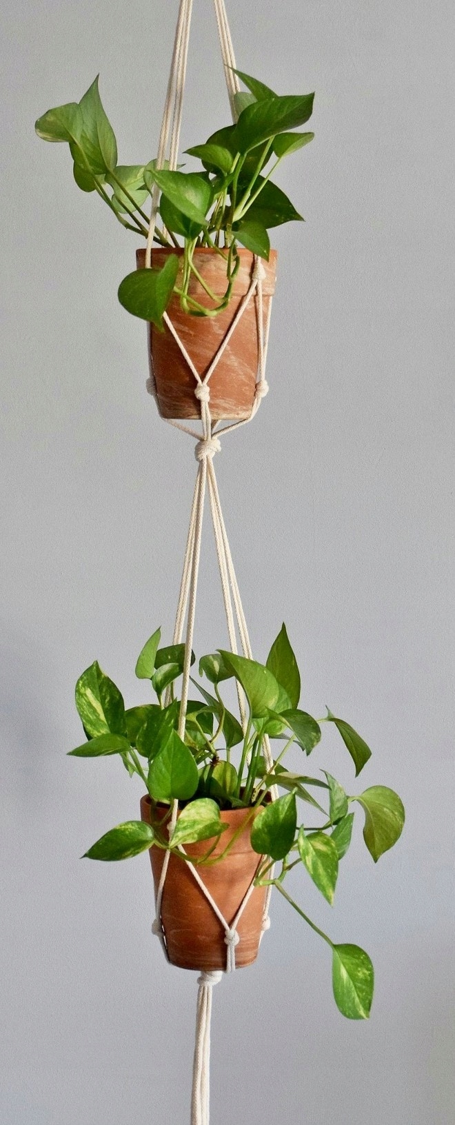 Это подставка для цветов, изготовленная вручную из натуральной хлопковой нити, вмещает два цветочных горшка.