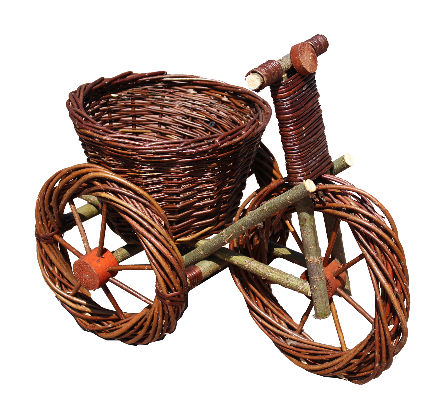 Велосипед – это плетеное садовое украшение для цветов. Он был сделан из некорой лозы и сосны. Все элементы точно подобраны. Велосипед, служащий цветочным горшком, – красивый элемент сада. Придает современный стиль. Устойчив к погодным условиям.