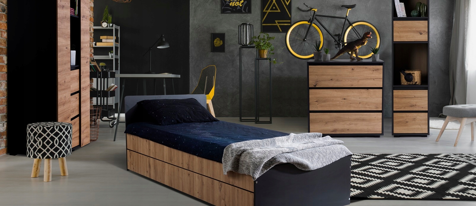 Молодежная кровать DALIA антрацит-дуб с двумя выдвижными ящиками для постельных принадлежностей обеспечивает дополнительное место для хранения. Кровать со спальным местом 200х90 обеспечит комфорт и крепкий сон. Молодежная кровать – интересный вариант для комнаты современного подростка.