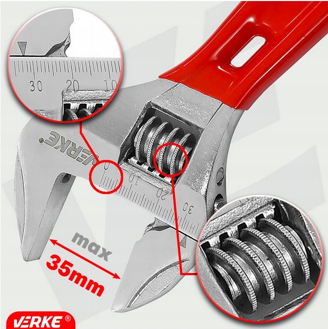 Разводной ключ длиной 160 мм и расстоянием между губками 0–35 мм выкован из прочной хромованадиевой стали.