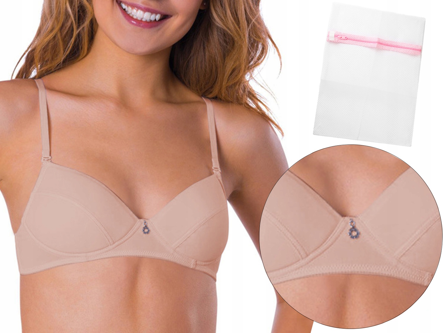 Одноцветный бюстгальтер для подростков. Бретельки в цвет бюстгальтера. Очаровательная деталь в виде крошечного кулона привлекает внимание. Бюстгальтер имеет жесткие чашки и съемные бретели. Чашечки усилены благодаря толстой мягкой губке и специальной строчке вместо косточек. Удобно носить – никаких металлических косточек. Идеальный крой для подростков 11-15 лет. Состав: 89 % Полиамид, 11 % Эластан.
