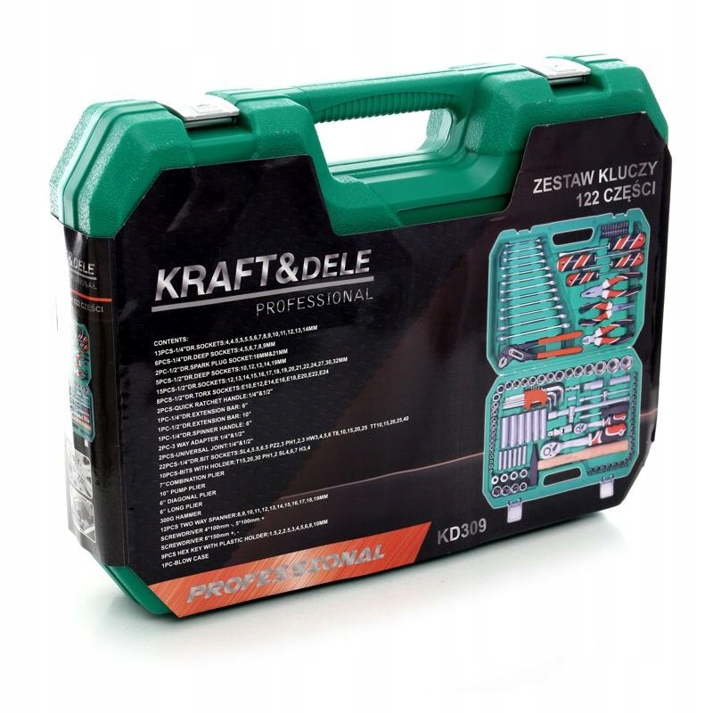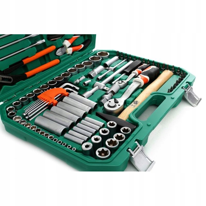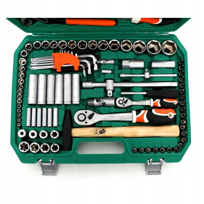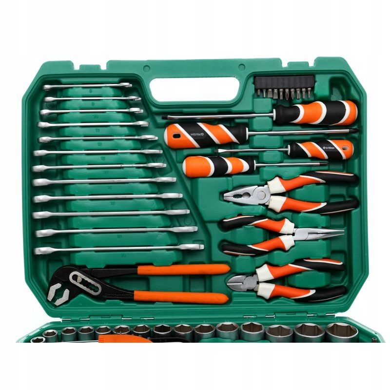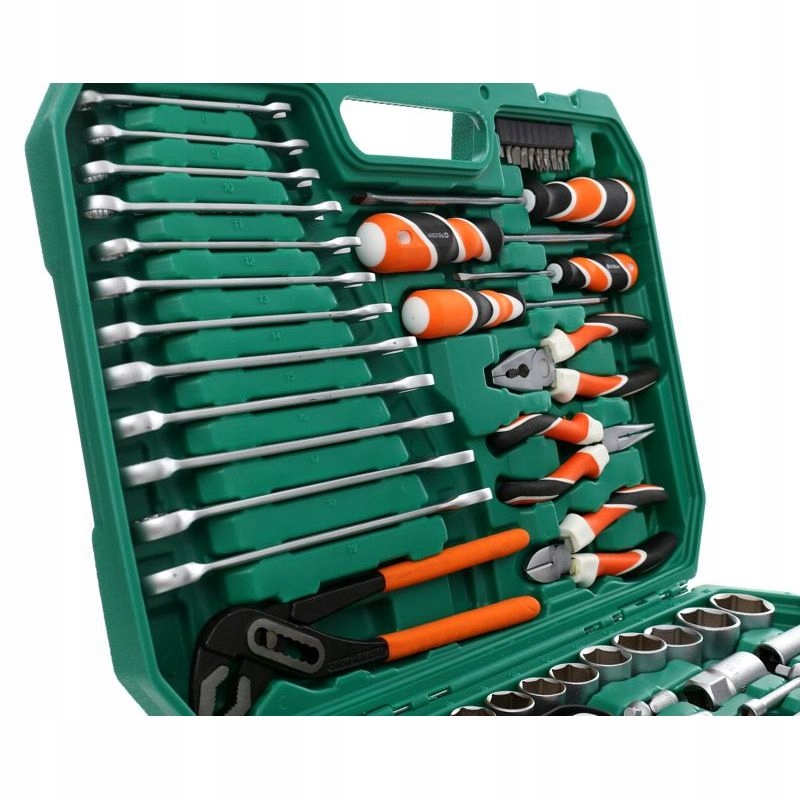 Набор торцевых ключей, торксов, шестигранных ключей, плоскогубцев и отверток состоит из 122 элементов, изготовленных из высококачественной хромованадиевой стали.