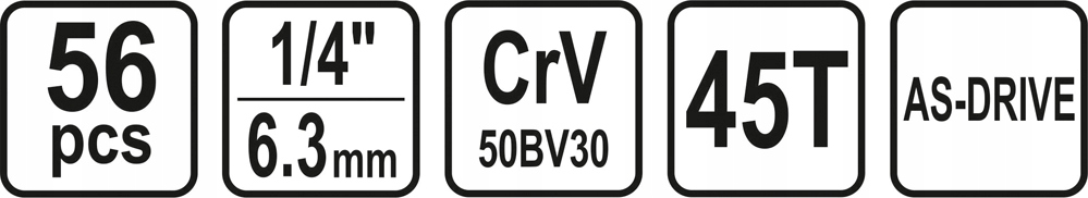 - короткие головки 1/4": 4; 4,5; 5; 5,5; 6; 7; 8; 9; 10; 11; 12, 13 мм, длинные головки 1/4": 6; 7; 8; 9; 10; 11; 12; 13 мм