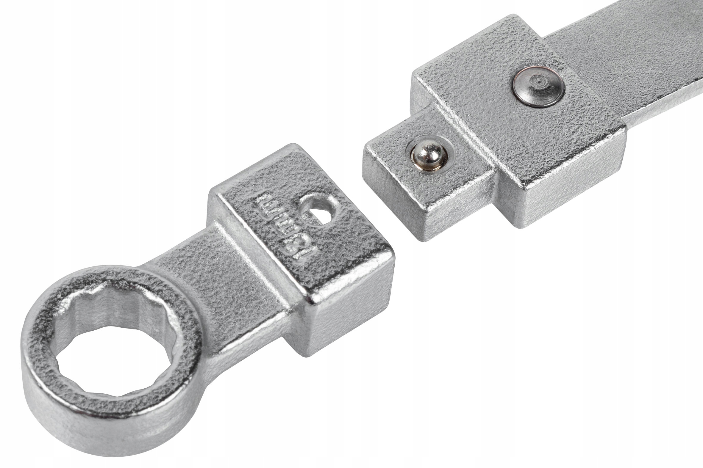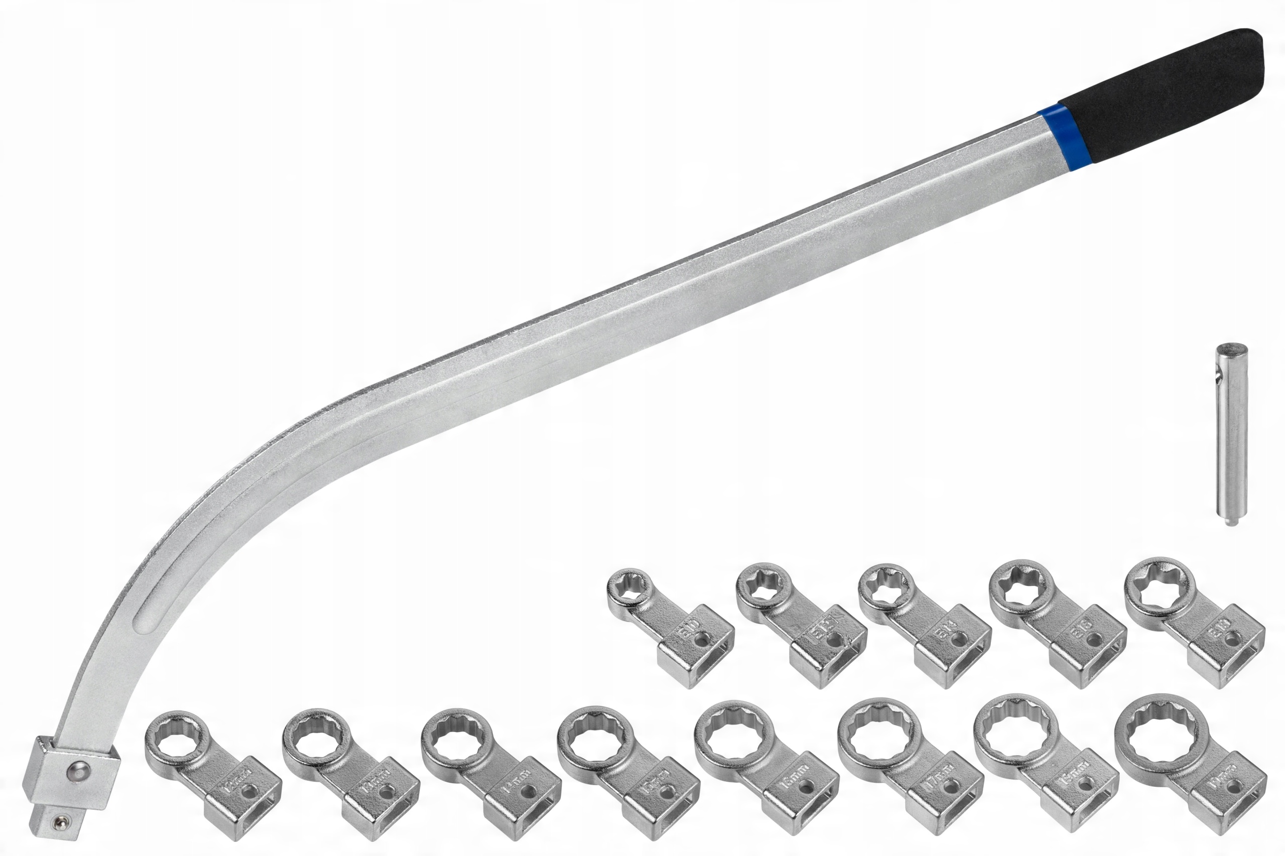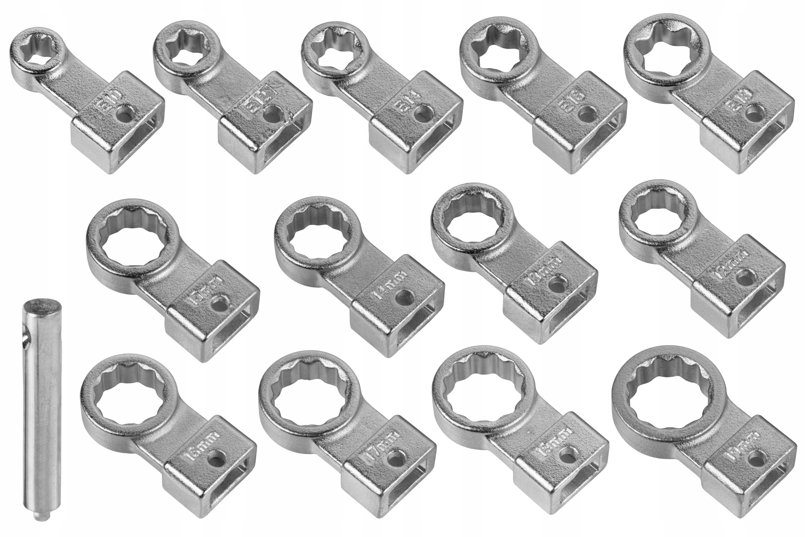 В комплект входят 8 кольцевых бит (12–19 мм) и 5 бит E-Torx (E10–E18), что обеспечивает универсальное использование.