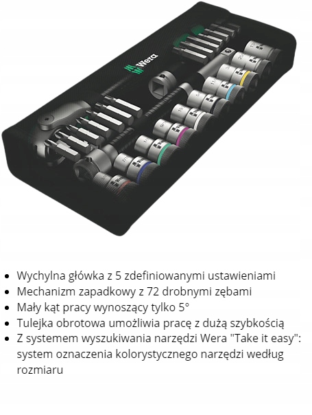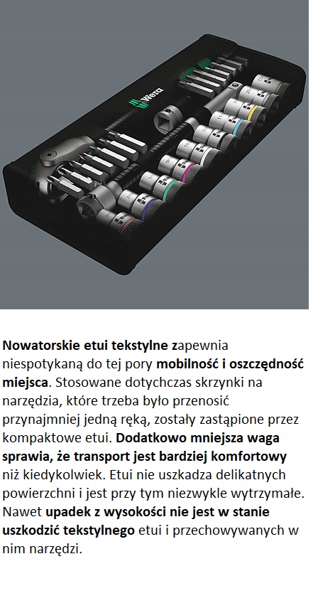 Чрезвычайно компактное расположение инструментов на небольшом пространстве. Абсолютно новый набор в очень прочном и прочном текстильном футляре. Можно разместить в вертикальном положении, что позволяет удобно хранить его на полке в мастерской. Текстильная ткань снаружи защищает поверхности, подверженные царапинам. Малый размер и малый вес обеспечивают высокую мобильность. С помощью системы поиска инструментов «Take it easy»: цветовая маркировка размера.