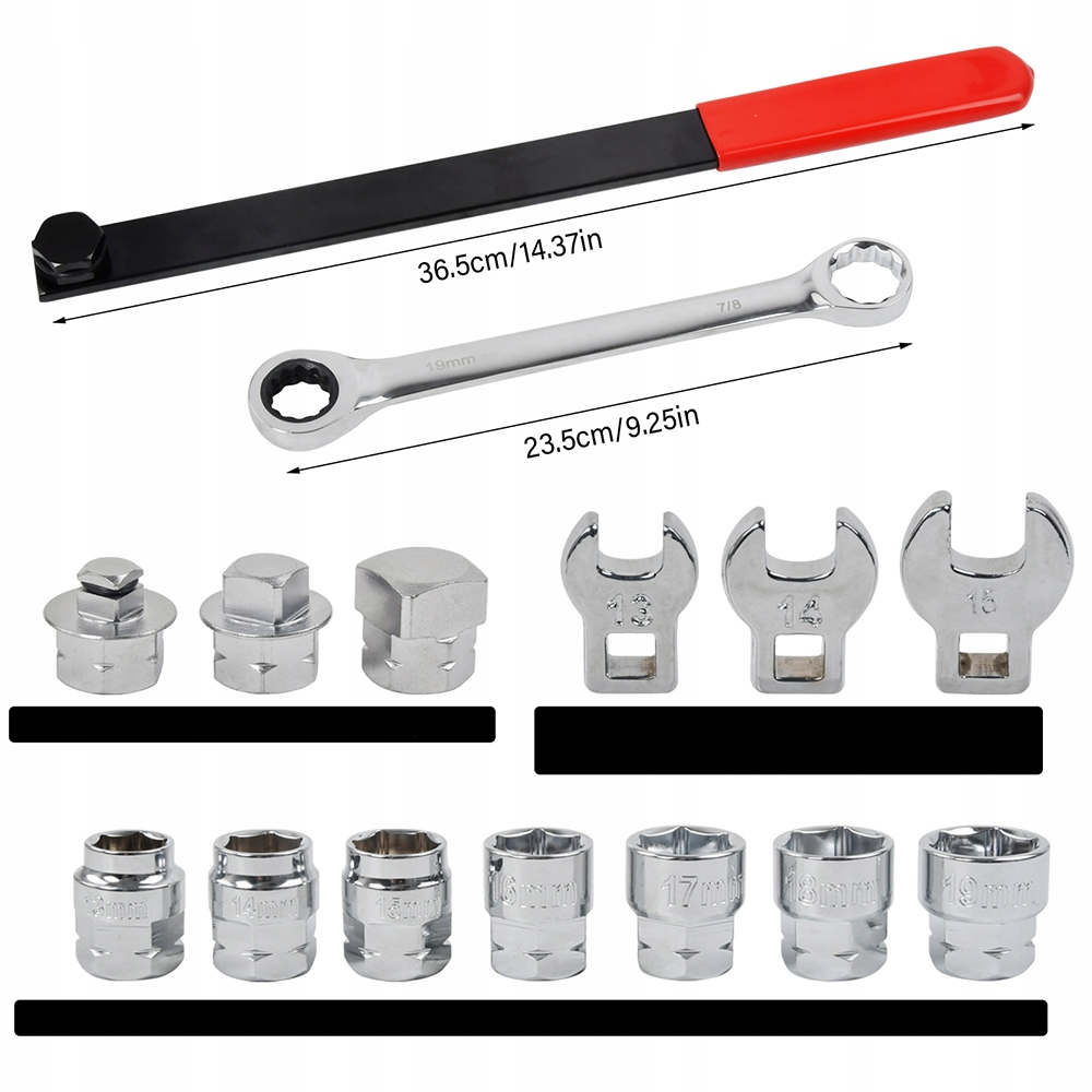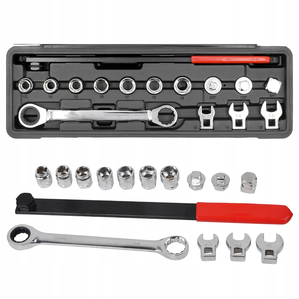 7 торцевых головок (13 мм, 14 мм, 15 мм, 16 мм, 17 мм, 18 мм, 19 мм) и 3 комбинированных ключа (13 мм, 14 мм, 15 мм). мм).