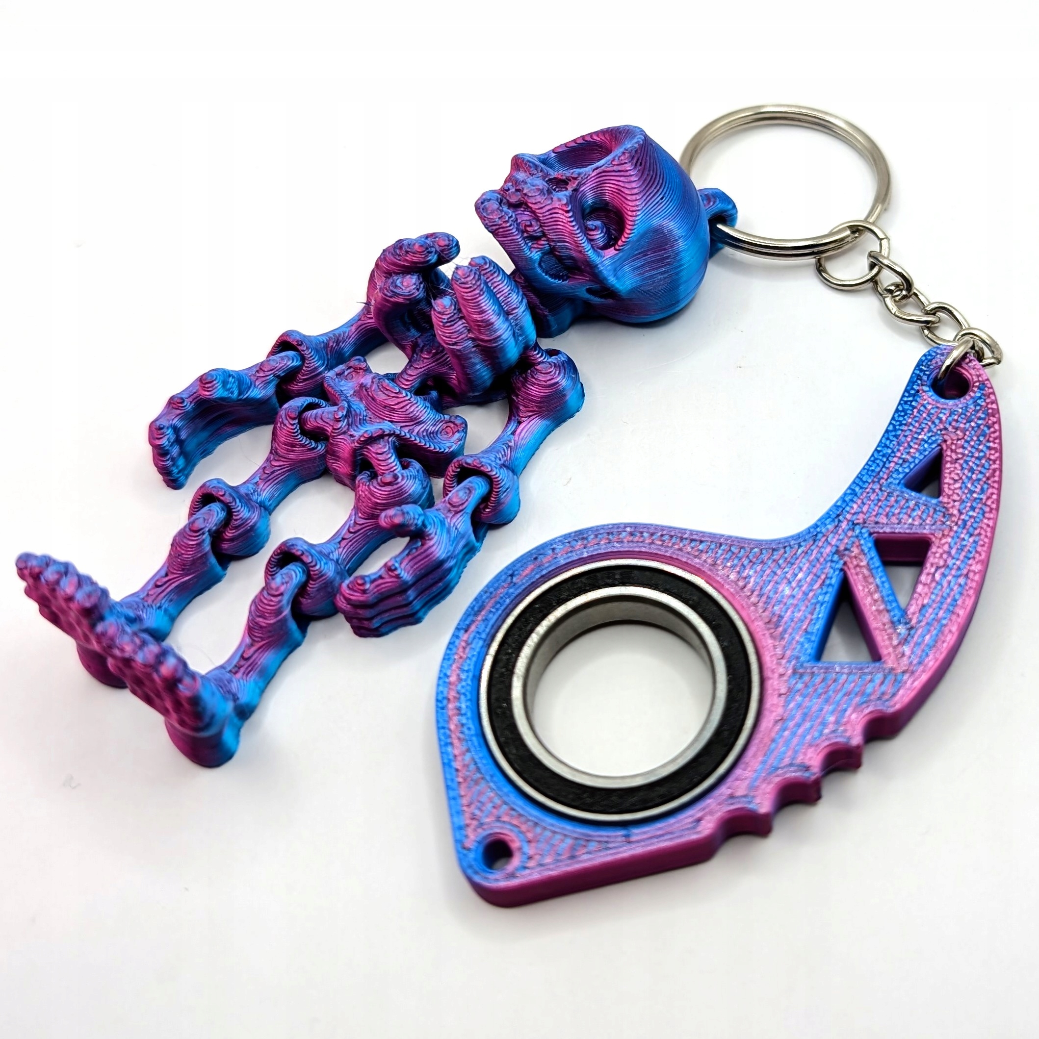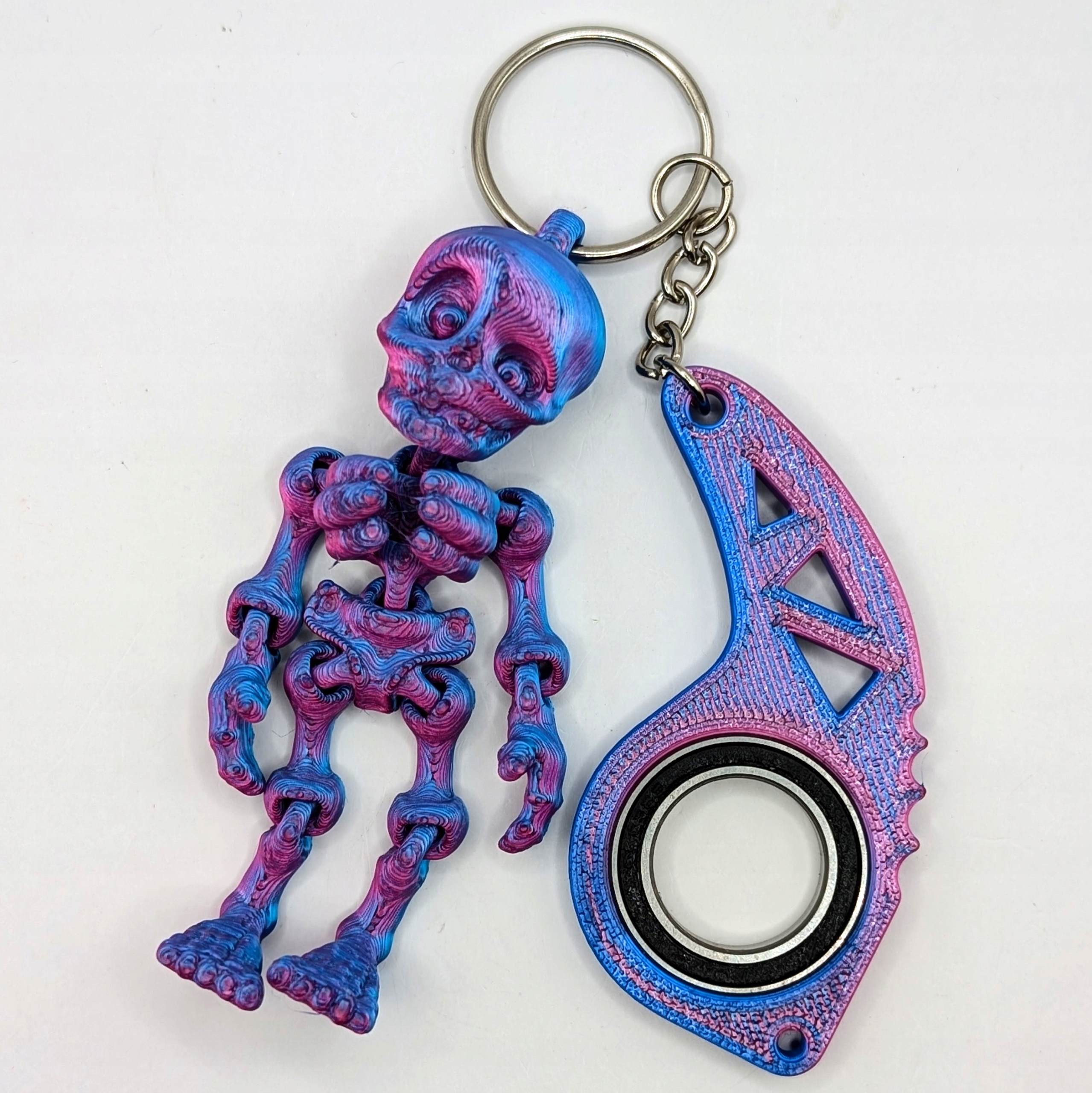 keyspinner keyrambit + kościoterup Keychain - это уникальный гаджет, который сочетает в себе функциональность с исходным дизайном. Изготовленная в технологии 3D -печати из планового материала , кольцо клавиша в цвете блестящей магии отличается впечатляющей, блестящей отделкой. keyspinner имеет вставленный подшипник, который допускает плавное вращение, и дополнительная деталь в форме скелета дает ключ уникальный, темный символ.