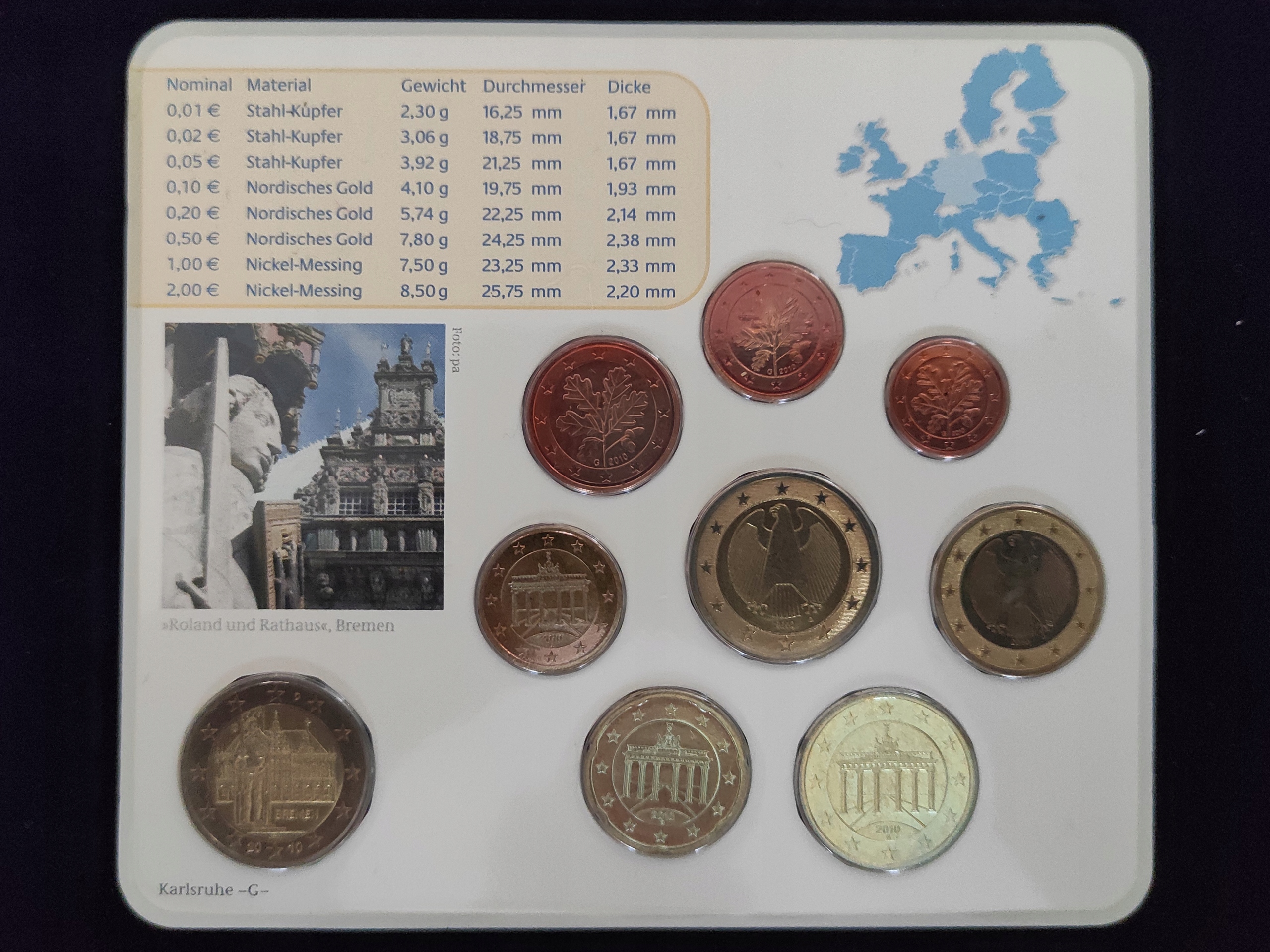 KMS Germany 2010 - G, набор монет от 1 цента до 2 евро +2 евро Бремен
